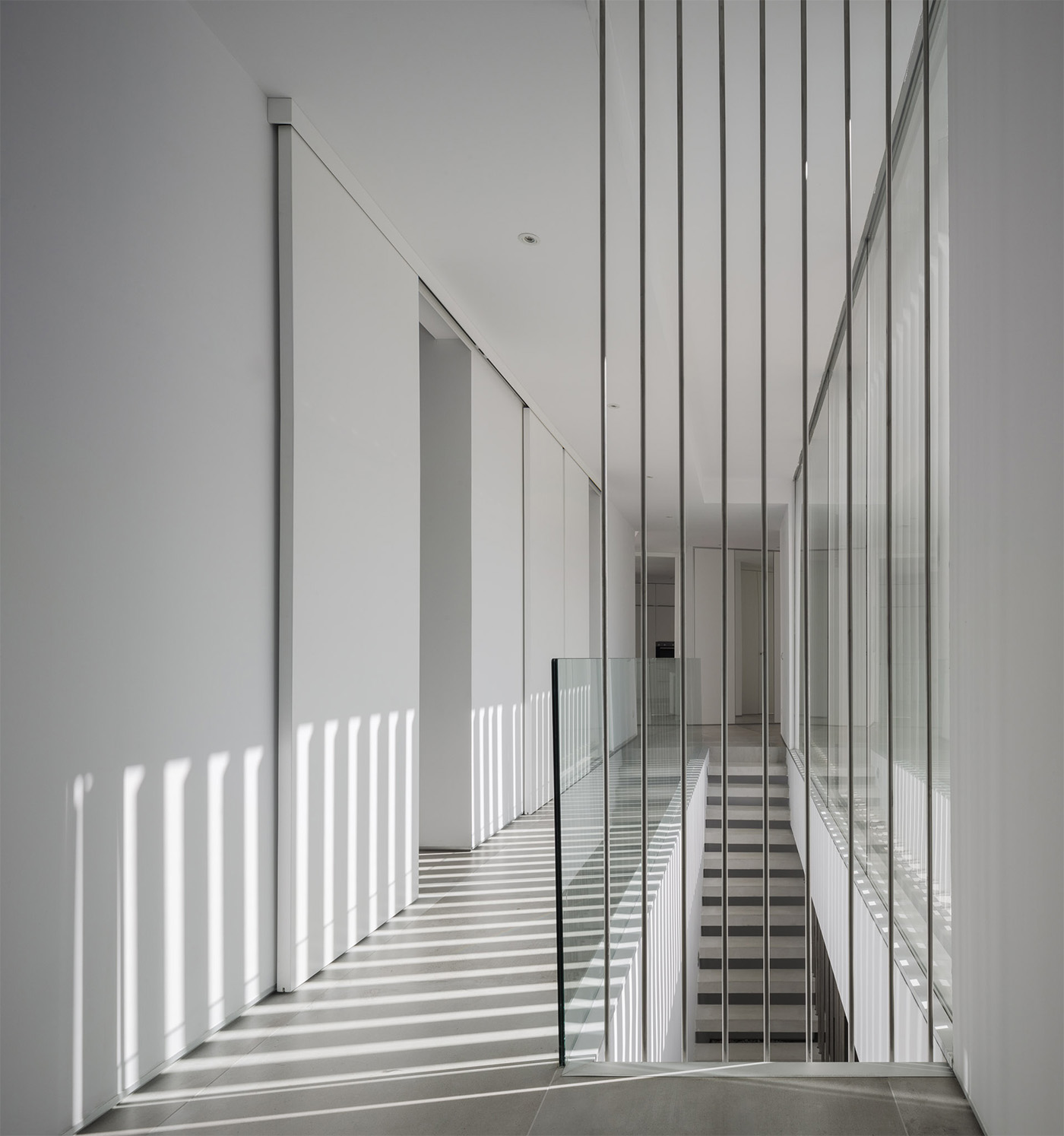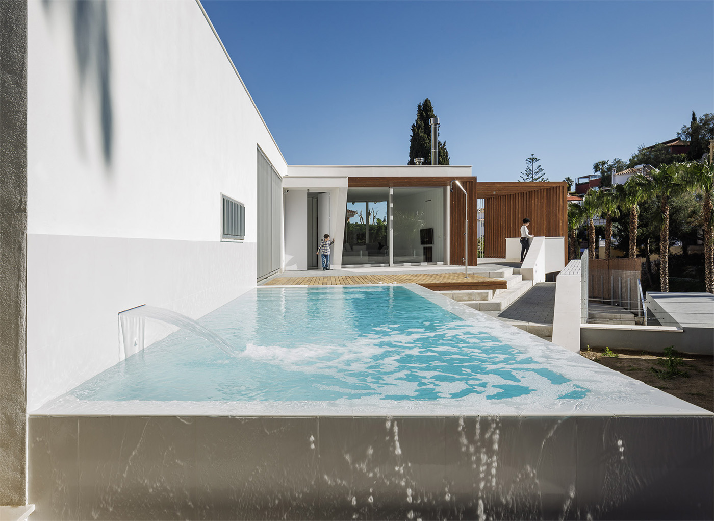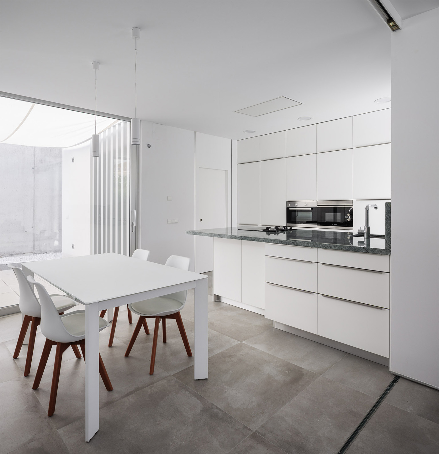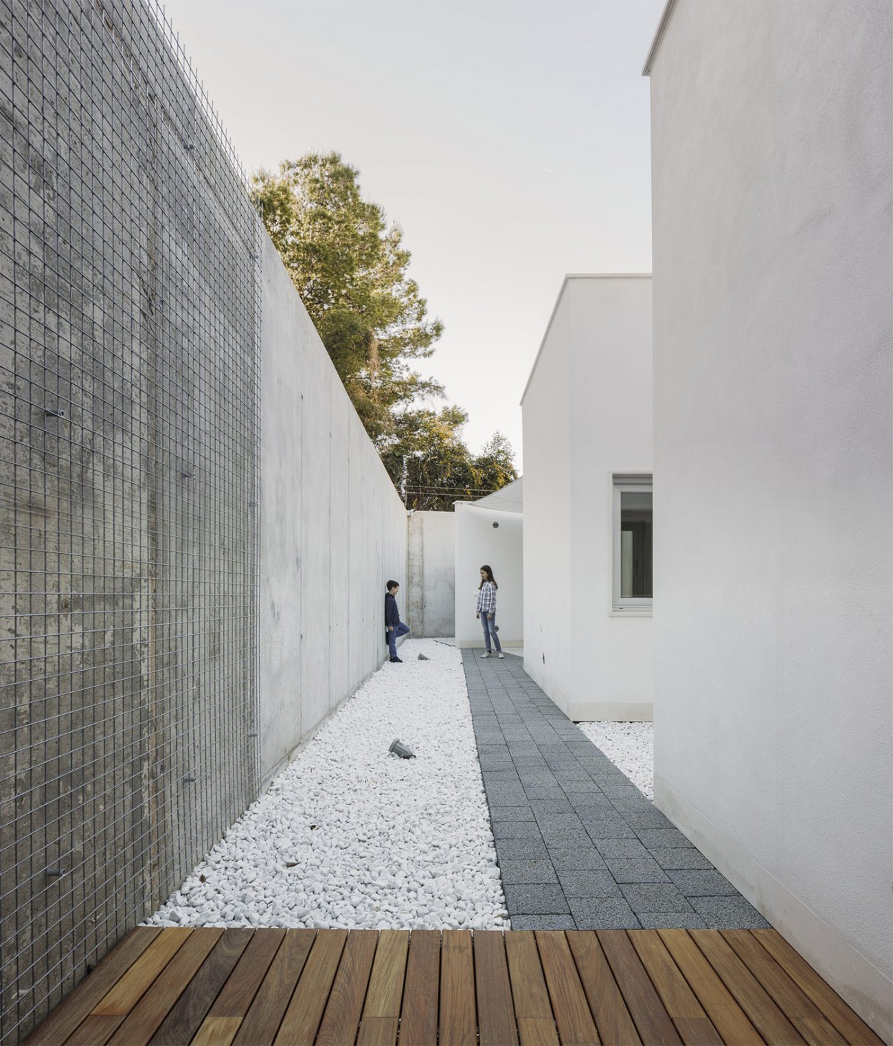 Las múltiples aberturas de las habitaciones hacia los espacios al aire libre, orientadas de manera diferente, le permiten captar los diferentes tonos de luz natural que cambiarán los espacios en tiempo real. La casa se acerca a la colina a través de un espacio externo conectado a la zona de dormitorio, donde el dormitorio principal se extiende hasta tocar el muro de contención, formando parte del patio.