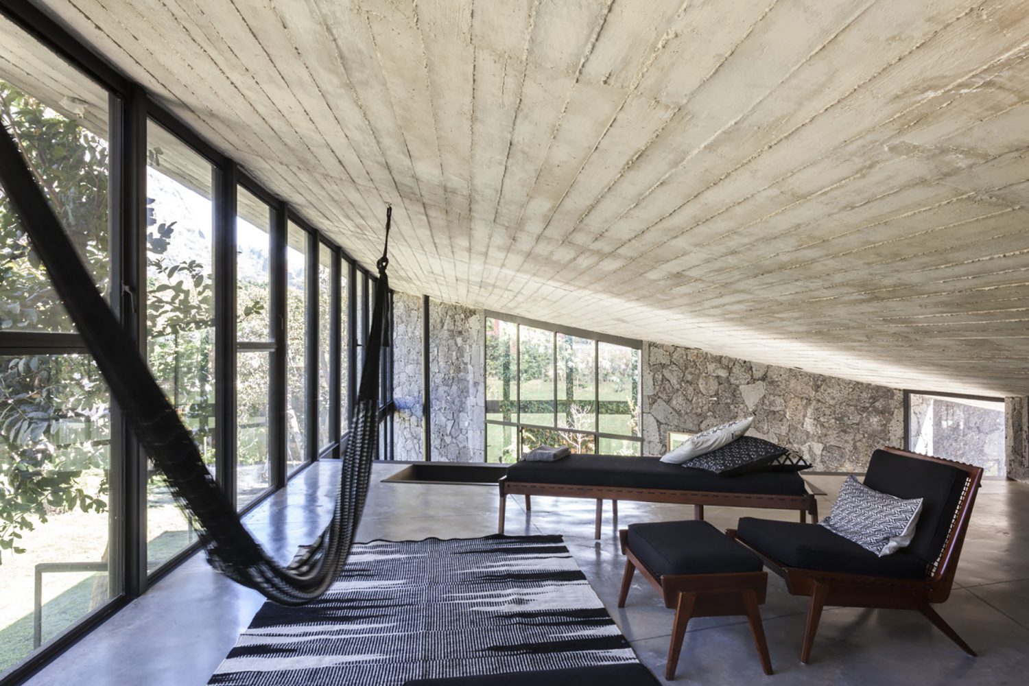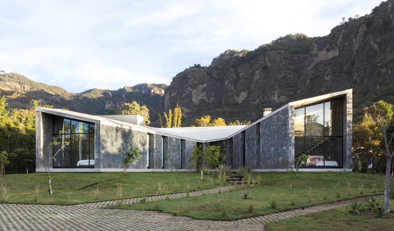 Forma envolvente e compenetración de la naturaleza, a través de grandes aberturas, definen el proyecto de esta villa concebida por el estudio mexicano Cadaval & Solà-Morales, donde se reinterpreta y modela la dureza de la piedra de las montañas rocosas.