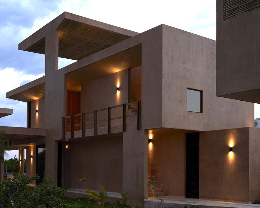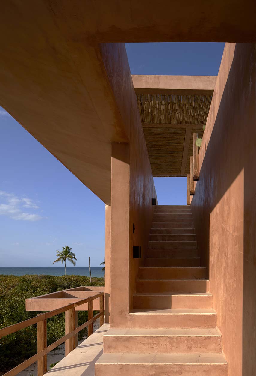La casa está articulada en tres pabellones dispuestos a lo largo de una parcela larga y estrecha, colocados de forma alternada para crear una secuencia de volúmenes e intersticios. Esta disposición genera un ritmo equilibrado entre espacios sólidos y vacíos, entre áreas públicas y privadas, entre ambientes abiertos y cerrados. Los pabellones, concebidos como cuerpos prismáticos de ancho mínimo, permiten vistas libres y continuas a lo largo de toda la propiedad, favoreciendo la ventilación transversal y manteniendo conexiones visuales constantes con el paisaje circundante.