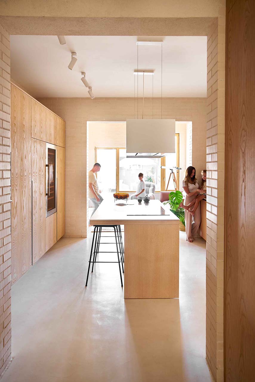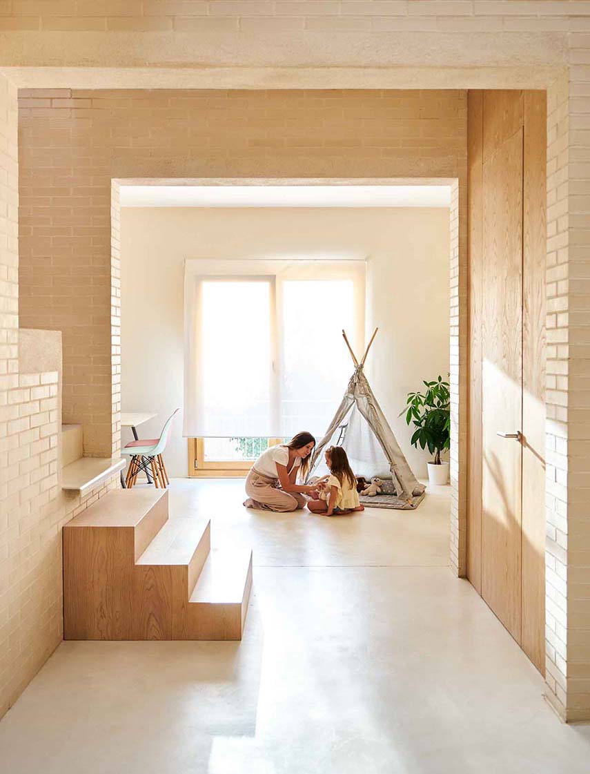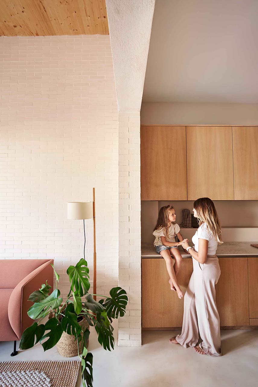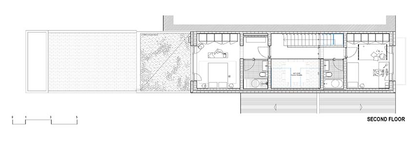 Casa Mariela cobró vida gracias al proyecto de Viva - Casas Sostenibles, un estudio conocido por la realización de proyectos de arquitectura sostenible e innovadora. El presupuesto limitado influyó en las decisiones de diseño, llevando a la eliminación de paredes internas y revestimientos superfluos. La planta estrecha y larga del terreno llevó a los diseñadores a imaginar la casa como una red de espacios interconectados, sin pasillos ni puertas. Los servicios esenciales, como los baños y la cocina, se colocaron a lo largo de las paredes laterales, creando un espacio central abierto que redefine la percepción de los ambientes domésticos.