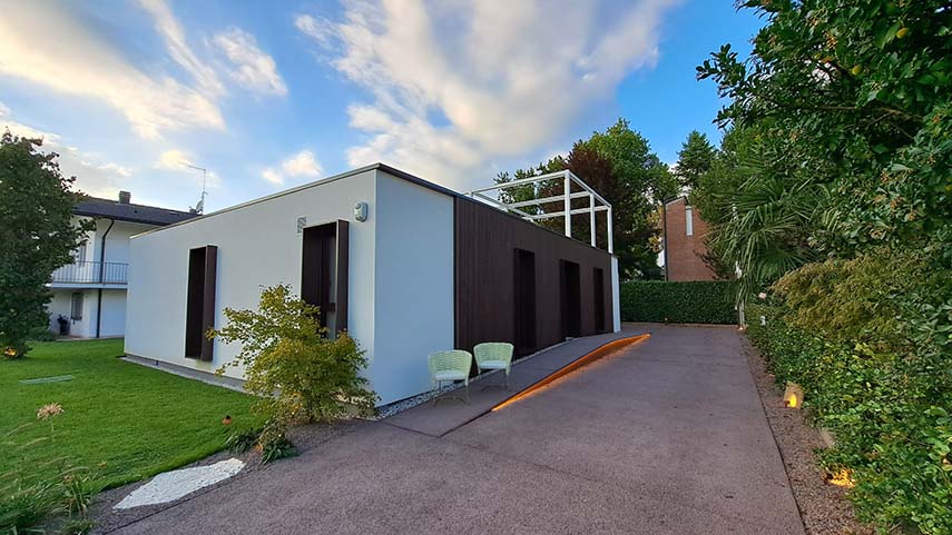 Para dar respuesta a esta visión, Andrea Calabrese Architetto ha elegido un sistema constructivo modular, que combina la elegancia del acero con la calidez de la madera. La villa modular no es solo un espacio habitable, sino una ventana abierta al mundo exterior. Con una apertura panorámica que alcanza los 12 metros de ancho, la sala de estar se expande sin límites hacia el jardín, brindando a los habitantes una experiencia de inmersión total en la naturaleza. Este gesto arquitectónico transforma la casa en una especie de refugio moderno, donde la vida interior y exterior se fusionan en un continuo perfecto.