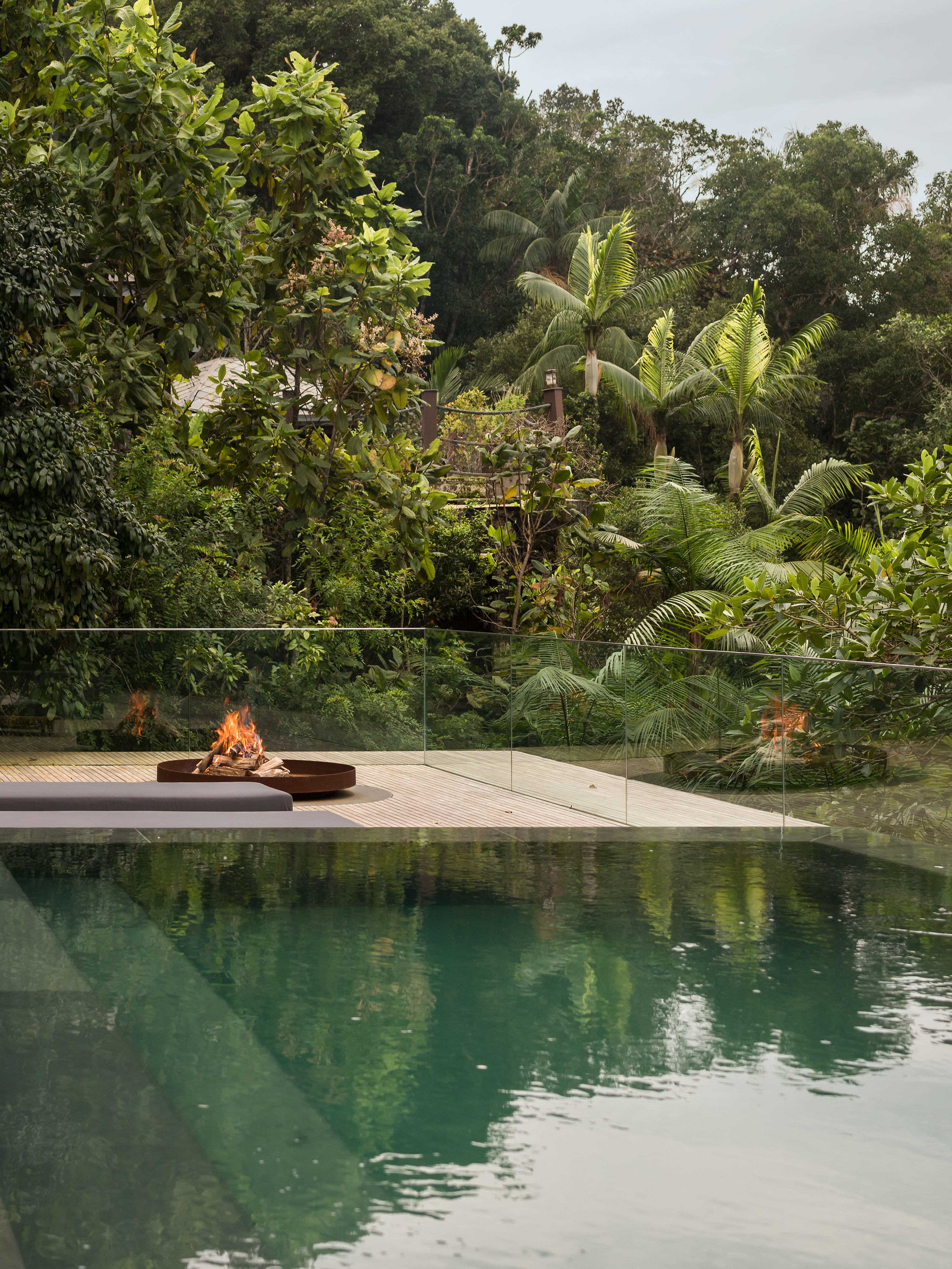 En Jungle House, el proyecto se define por un corte transversal que permitió posicionar la piscina de forma semi-integrada en la losa: de borde infinito y elevado con respecto a la altura del puente, hace que la vista y el paisaje sirvan como extensión de la línea de flotación de la piscina