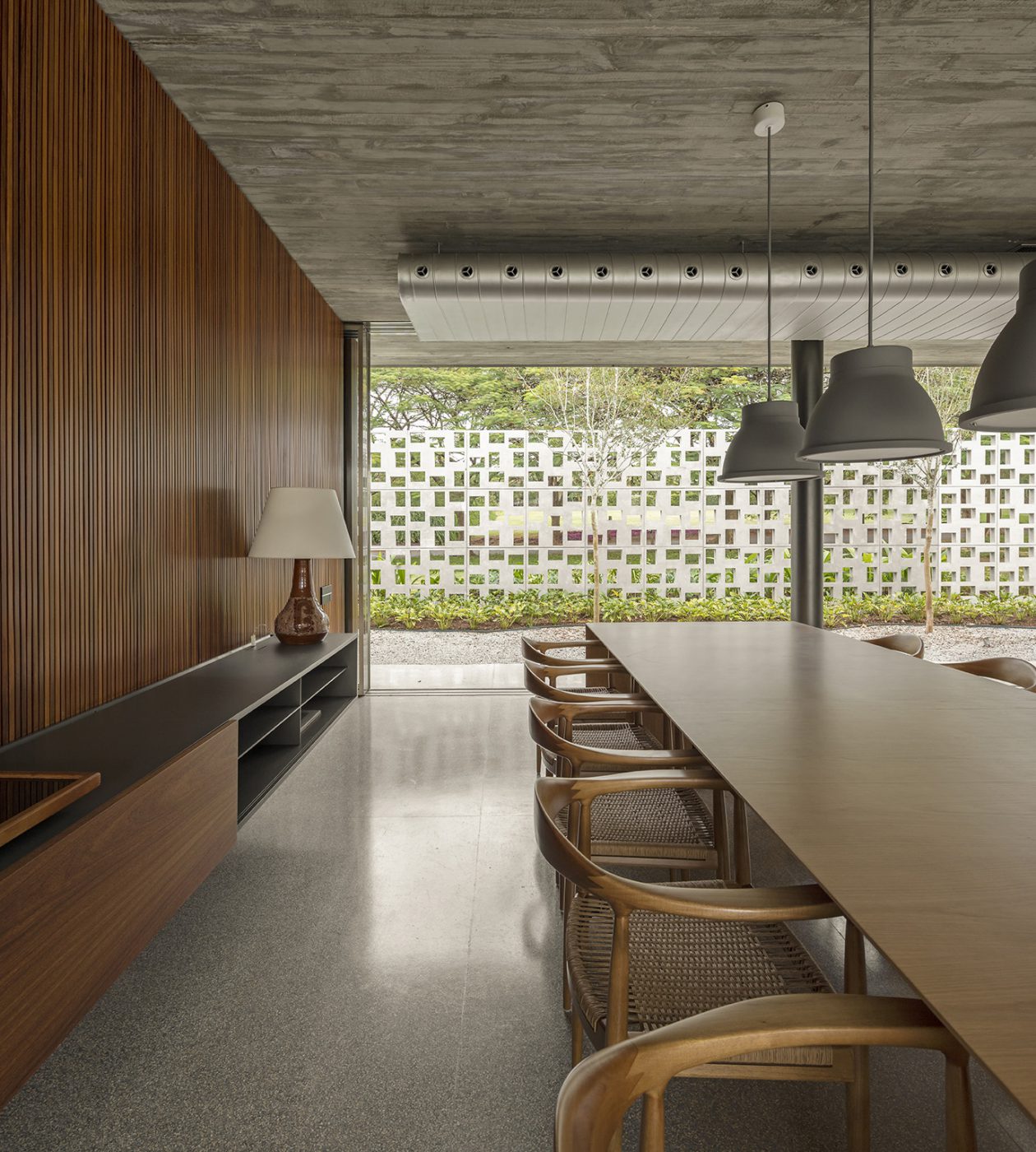 La distribución consta de dos núcleos: uno social y otro privado. En el área social, el uso de transparencias y la posibilidad de abrir completamente las ventanas articulan el jardín, creando vistas de totalidad hacia el suelo. El núcleo social se fusiona con la tierra, dejando solo la presencia de un volumen y una gran terraza. Debido a las altas temperaturas de la región, la necesidad de usar aire acondicionado se ha reducido al mínimo gracias a la ventilación cruzada creada por el diseño del proyecto: la losa de concreto proyectada a cuatro metros de la fachada protege a las habitaciones de la incidencia directa del sol.
