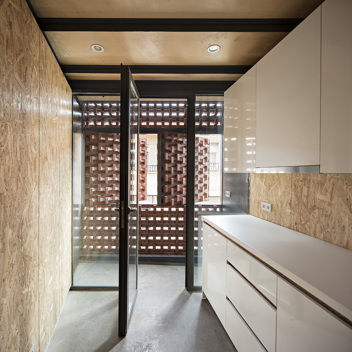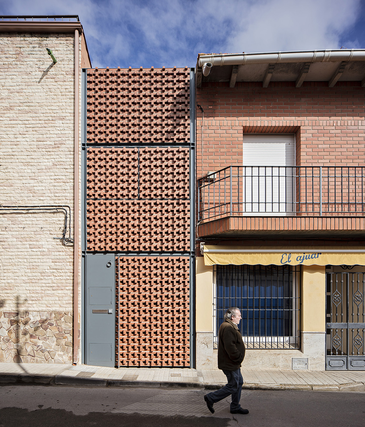 El estudio muka arquitectura, en el proyecto Casa Piedrabuena, con la intención de unificar las fachadas adyacentes a la casa, propone una fachada de cerámica con un entramado poroso y vibrante, que filtra la entrada de luz en el interior