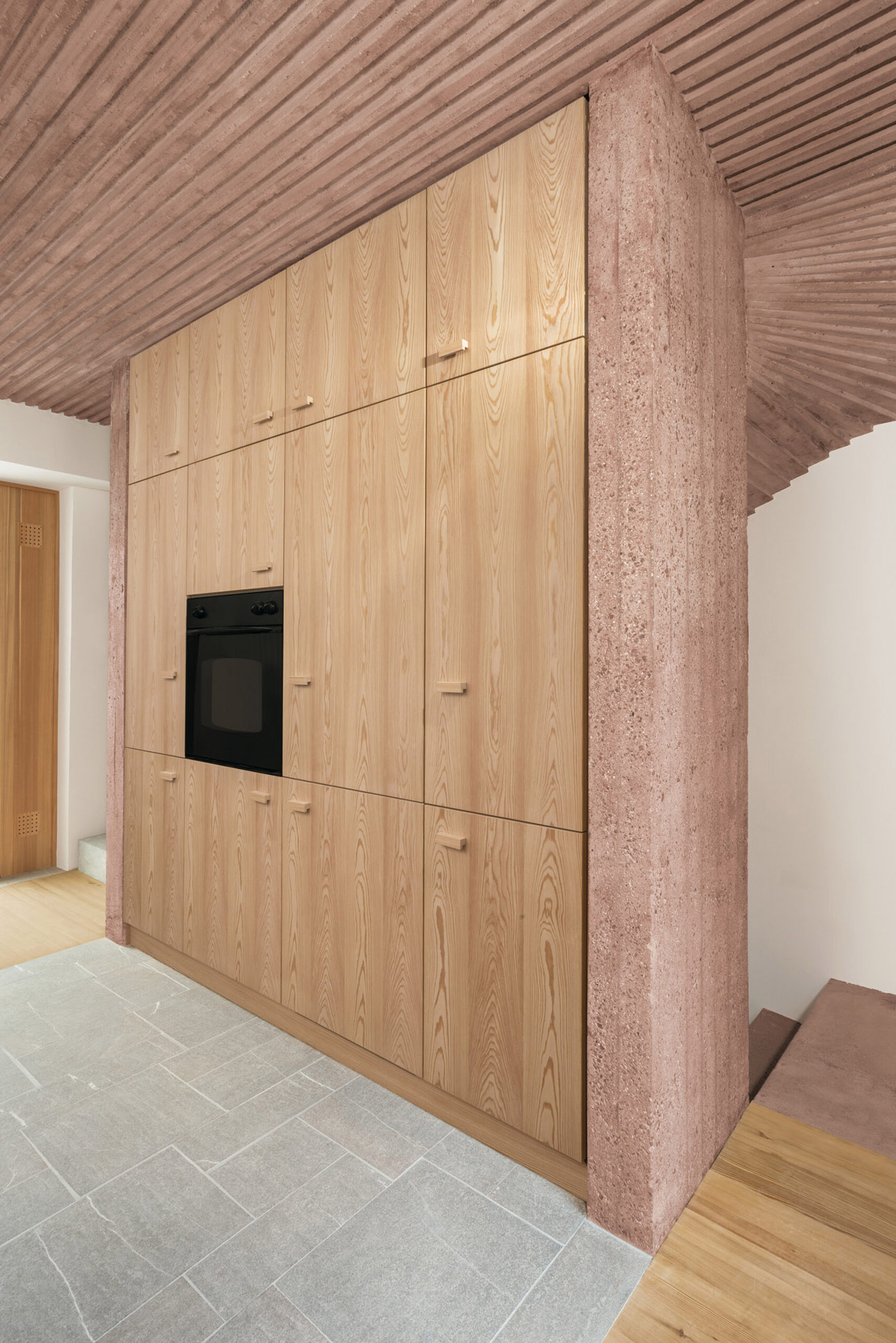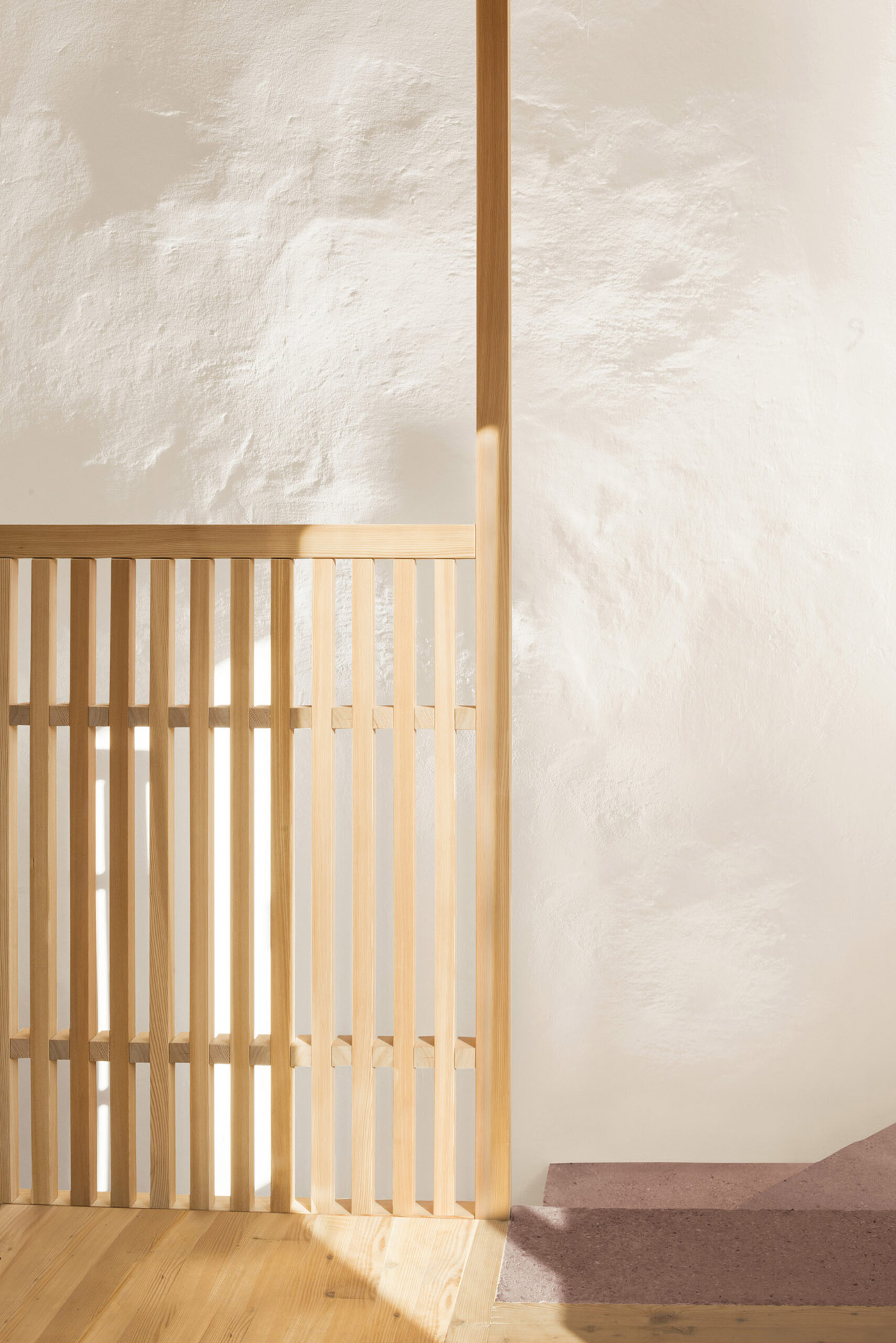 Los detalles y el color de la reestructuración de la pequeña casa derivan de las antiguas pinturas de la casa, así como la elección de colocar clavos en la fachada, donde antes se secaban las flores