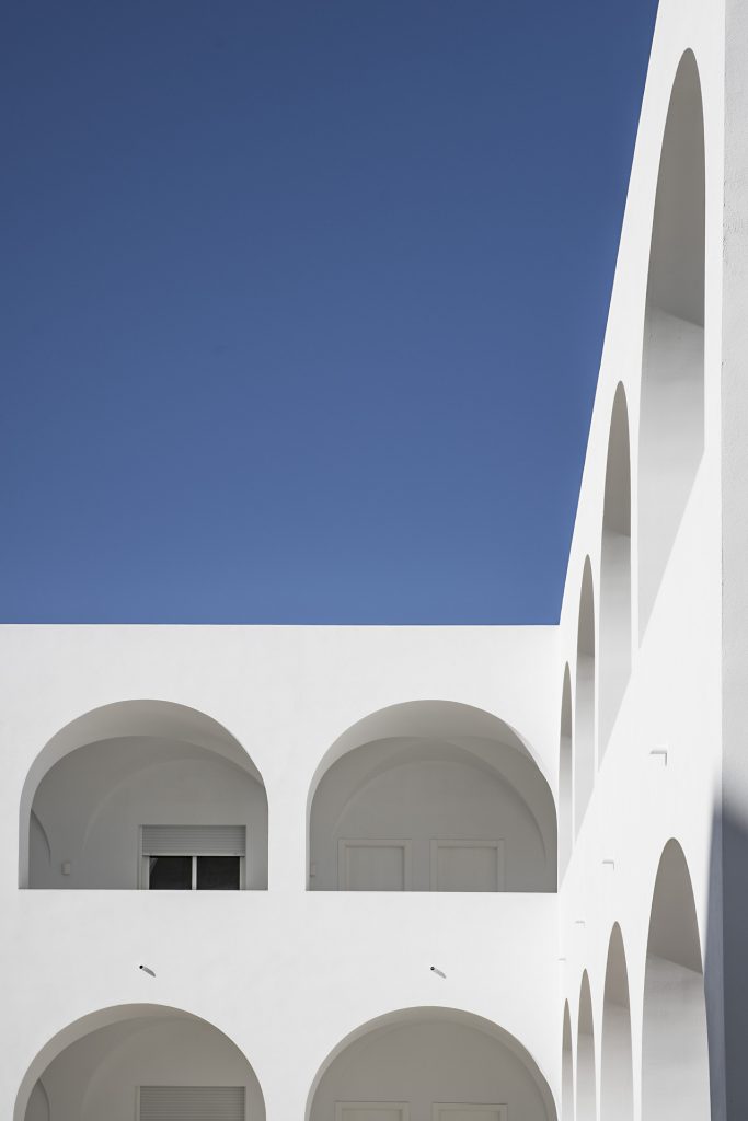 Junto a los antiguos muros, se diseña un perfecto patio central, de forma cuadrada. Se utiliza el rigor geométrico, todo se muestra minimal y perfectamente proporcionado, y hay una clara referencia a los claustros de los conventos, ideal para ser un piso de un centro parroquial