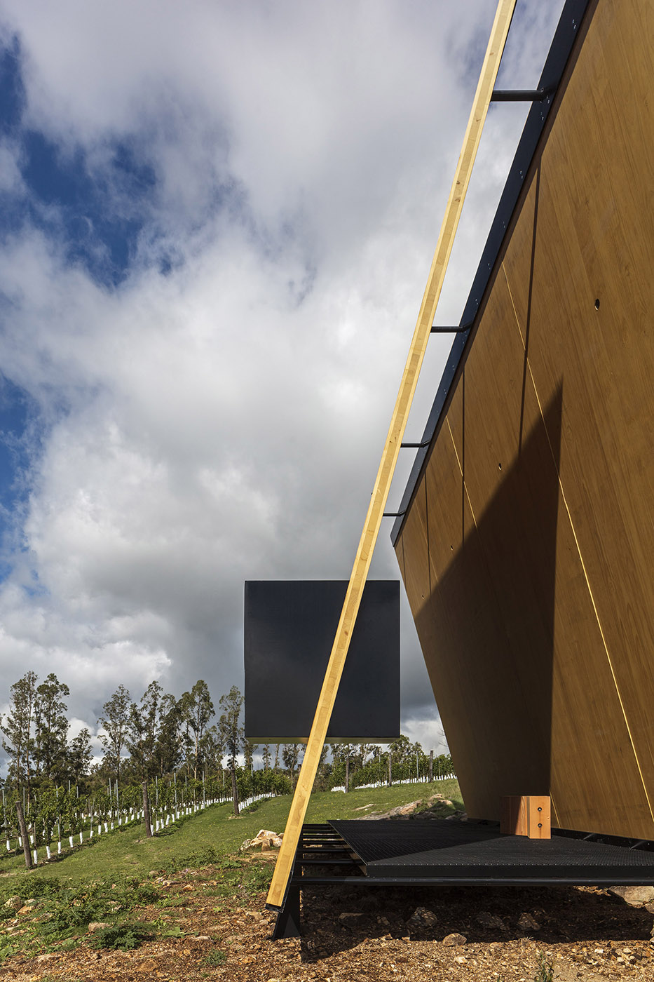 Dos losas de madera se apoyan entre sí sin tocarse, santificando una pequeña porción del paisaje. La capilla se prefabrica en Portugal y luego se transporta al sitio para ser ensamblada en un día