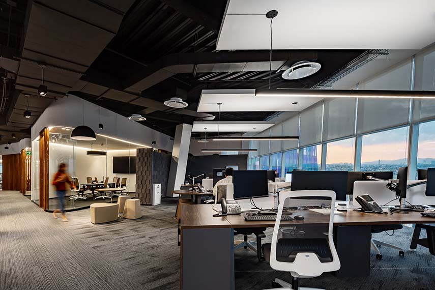 Para lograr la distribución ideal, fue fundamental respetar los ejes y la forma del edificio, concentrando en el núcleo central todos los espacios cerrados y dejando un área abierta donde se instalaron sistemas tipo "bench" pegados a la fachada para aprovechar la iluminación natural