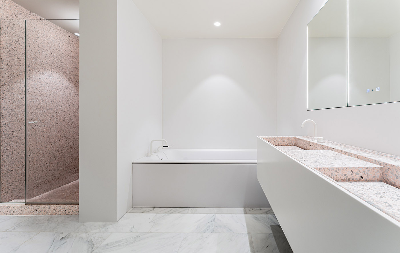 El baño principal y los baños de invitados tienen personalidades muy diferentes. En el primero, el refinado tono de las paredes de Corian blanco y la bañera contrasta armoniosamente con el agradable tono rosado de la piedra que compone la encimera del lavabo y las paredes de la ducha, mientras que el baño de invitados muestra un aspecto decididamente refrescante y relajado con su lavabo de piedra caliza flotante y las paredes de la ducha de terrazo