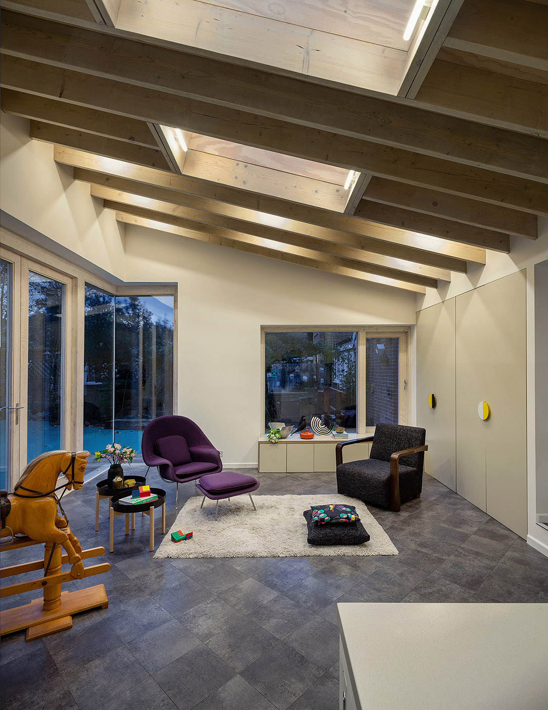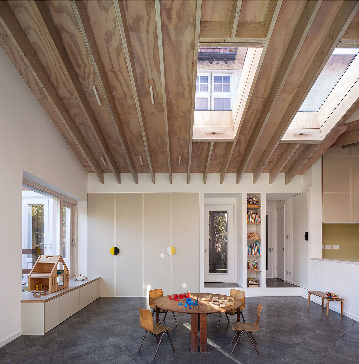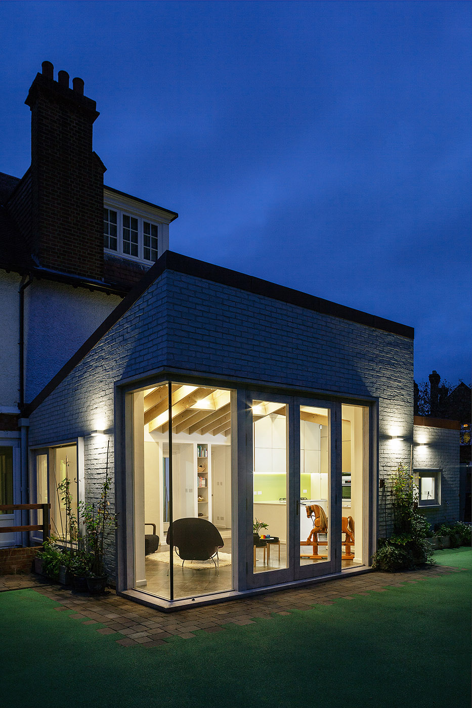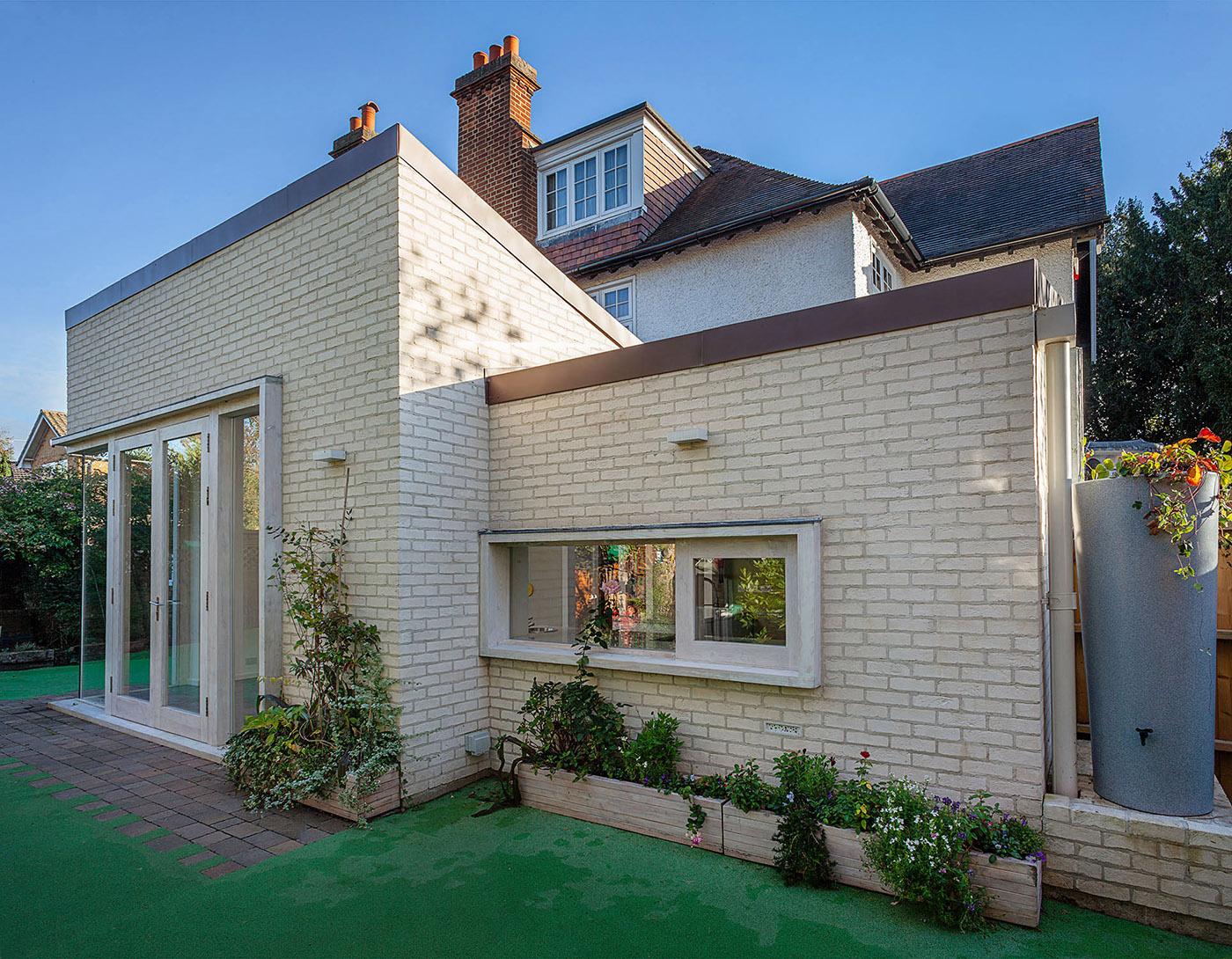 La ampliación se realiza a expensas de un garaje abandonado, que consta de dos volúmenes separados: el más pequeño alberga la cocina, el más grande el comedor. Los dos volúmenes son de planta rectangular, con un techo inclinado, uno alejado del otro
