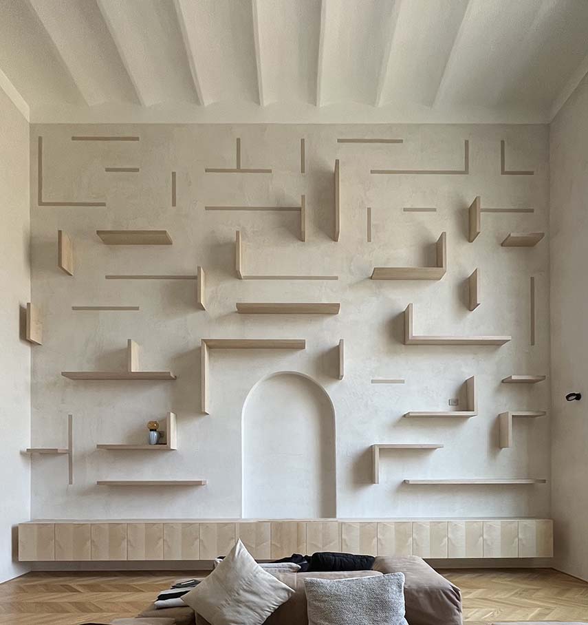 En el barrio Esquilino de Roma, esta vivienda de 300 metros cuadrados distribuida en tres niveles es objeto de uno de los últimos proyectos de diseño de interiores del arquitecto Filippo Bombace. La propiedad original presentaba características valiosas como los azulejos de terrazo en algunos suelos, las escaleras de piedra, maderas e intonacos con tonos cálidos y una materialidad fuerte que reflejan el gusto de los propietarios. Una parte importante del trabajo fue remover la imagen brillante y oscura burguesa superpuesta por las intervenciones de principios del siglo XX
