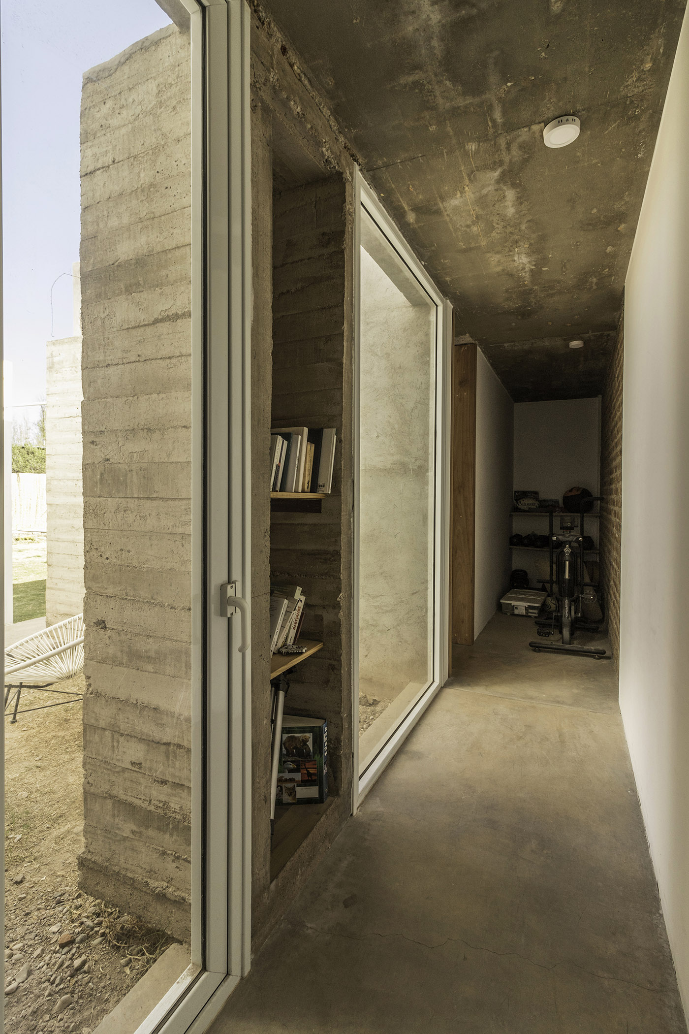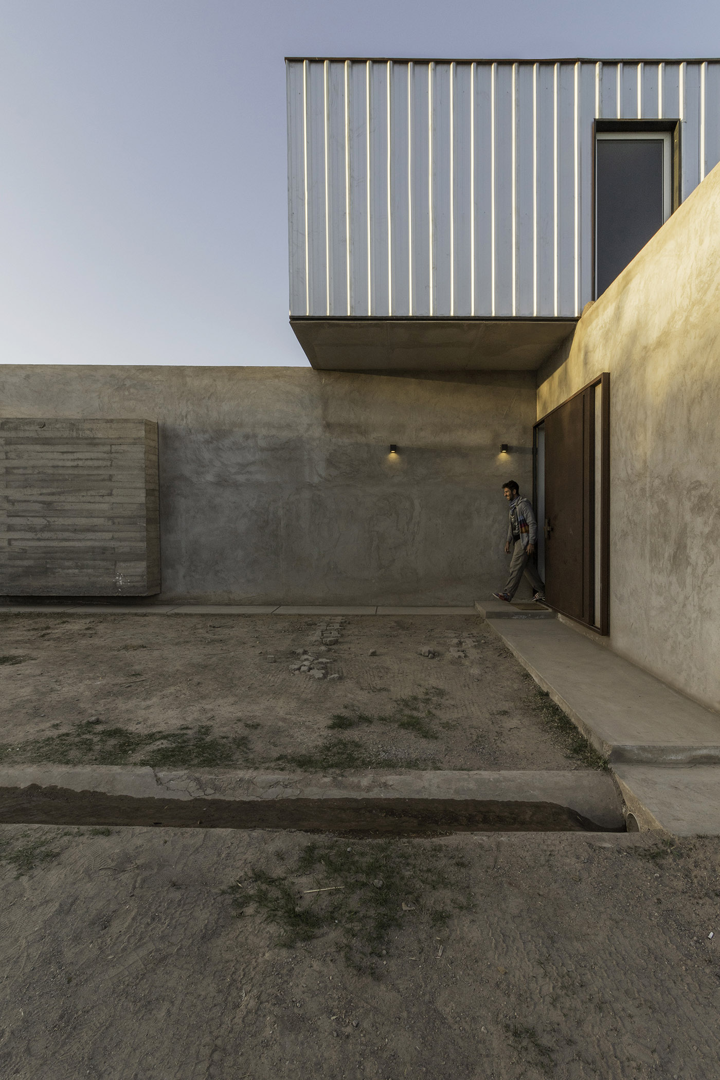 La elección de los materiales se basa en dos premisas diferentes según el nivel: la primera planta en hormigón armado con terminación vista y muros de mampostería, y la primera planta con estructura metálica revestida de chapa acanalada