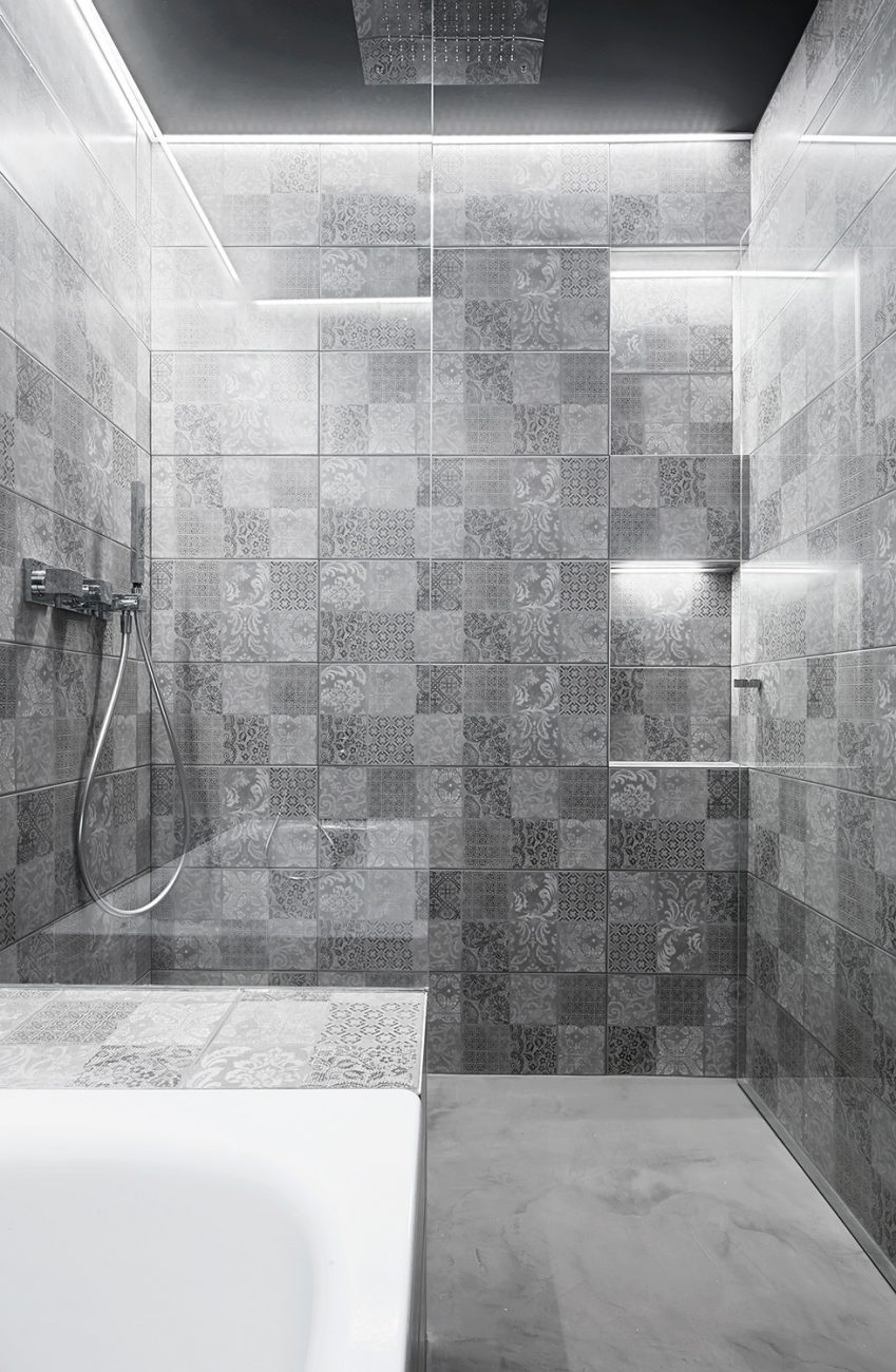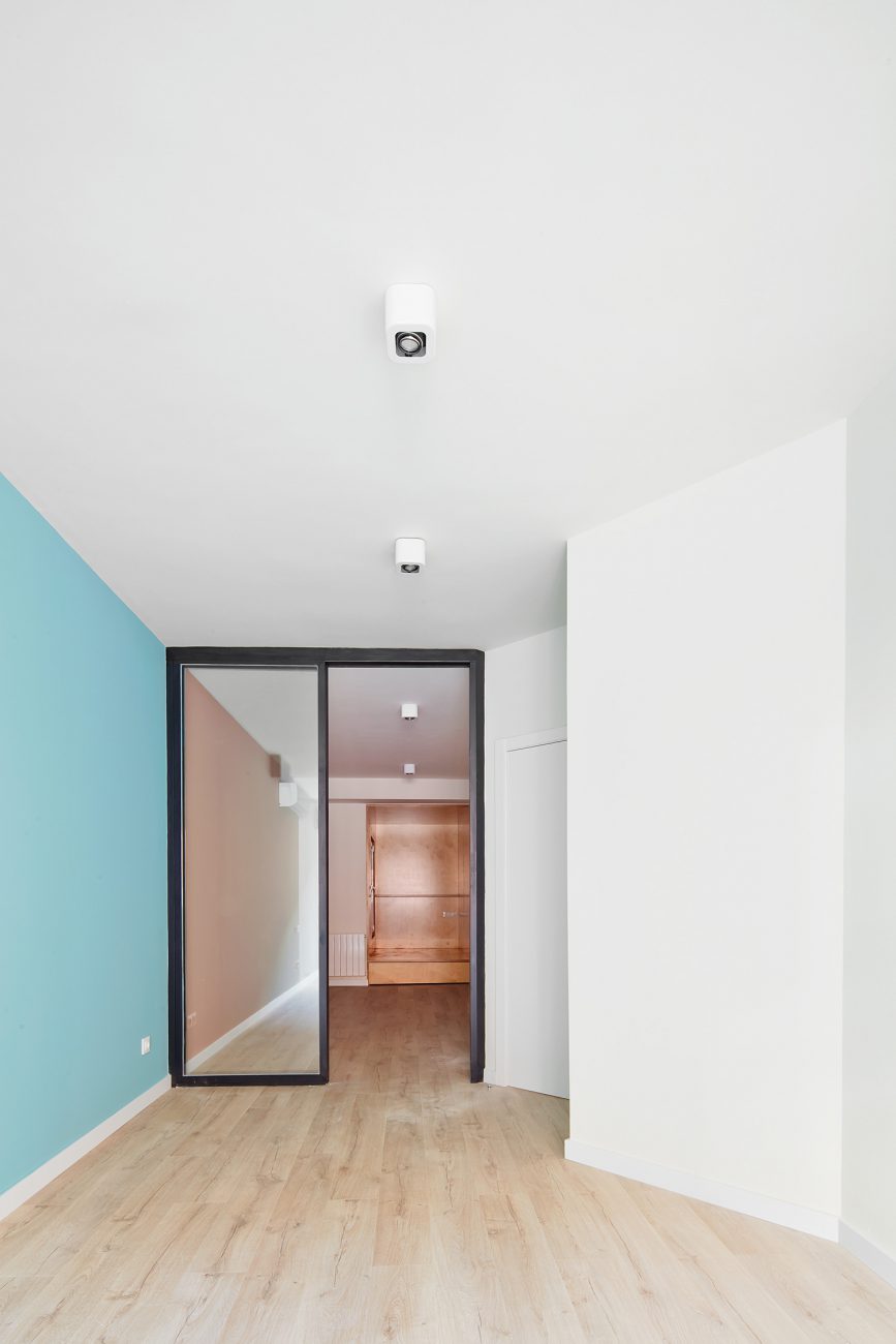 El baño es una habitación oscura y brillante que muestra un espejo retroiluminado. Las habitaciones están tratadas con diferentes colores en la pared que las conecta, pero debido al acceso de 45 grados, al entrar parecen habitaciones independientes. Algunos pilares y vigas de hormigón se han dejado visibles para subrayar la estructura subyacente y dar a la habitación una textura adicional. Estas superficies también se utilizaron para ocultar la iluminación