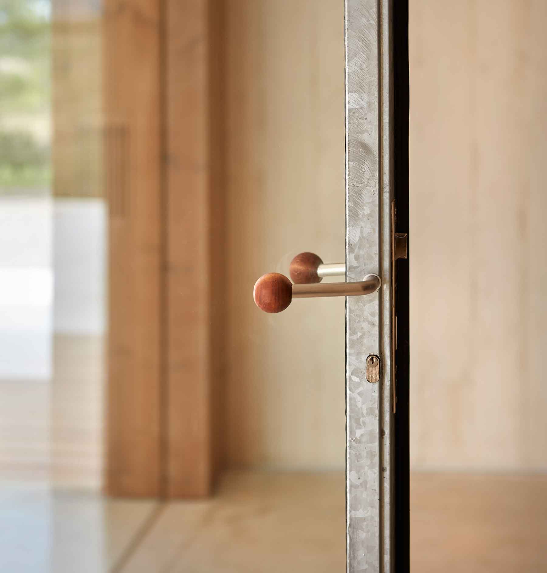 A través de una estructura de madera se entra a la casa: el espacio central se presenta como un área común, dominada por una gran chimenea, en la que se abren todas las habitaciones