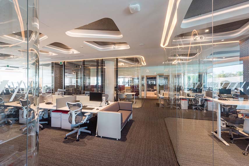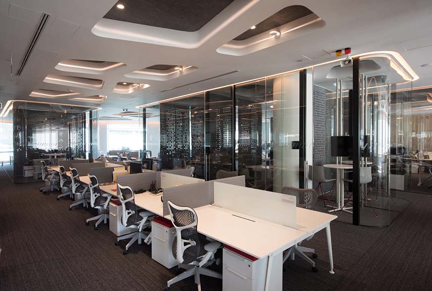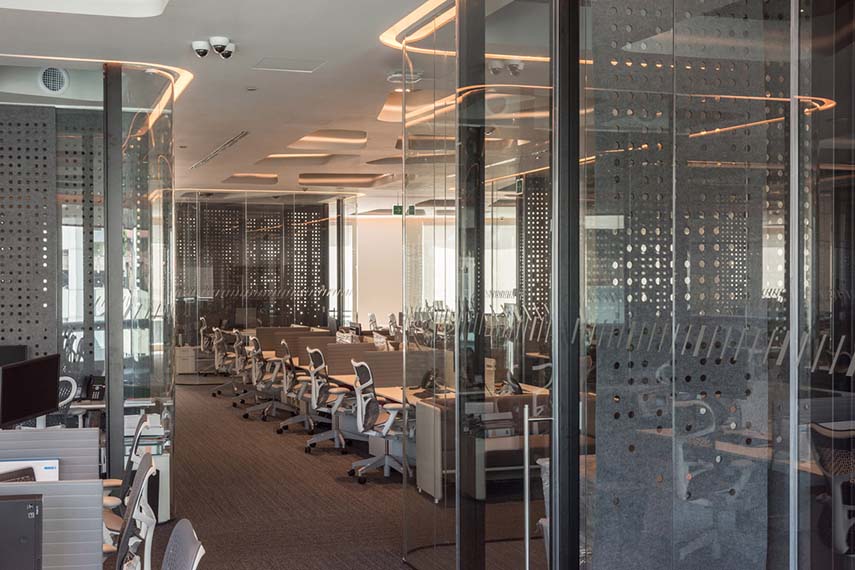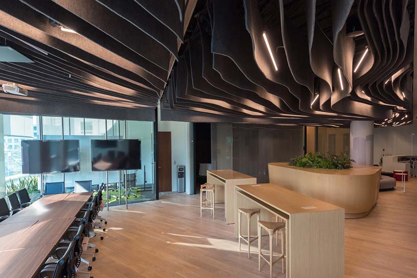 El diseño del espacio abierto contempla un techo de forma orgánica compuesto por tiras suspendidas de Tekne Roll, que proporciona una sensación de señalización prodigiosa y dirige la trayectoria espacial hacia una vista generosa del complejo Arcos Bosques, otorgando una sensación de infinitud. Las salas de reuniones han sido equipadas con paneles acústicos y las nuevas paredes se han construido de hormigón, reforzando los elementos verticales existentes
