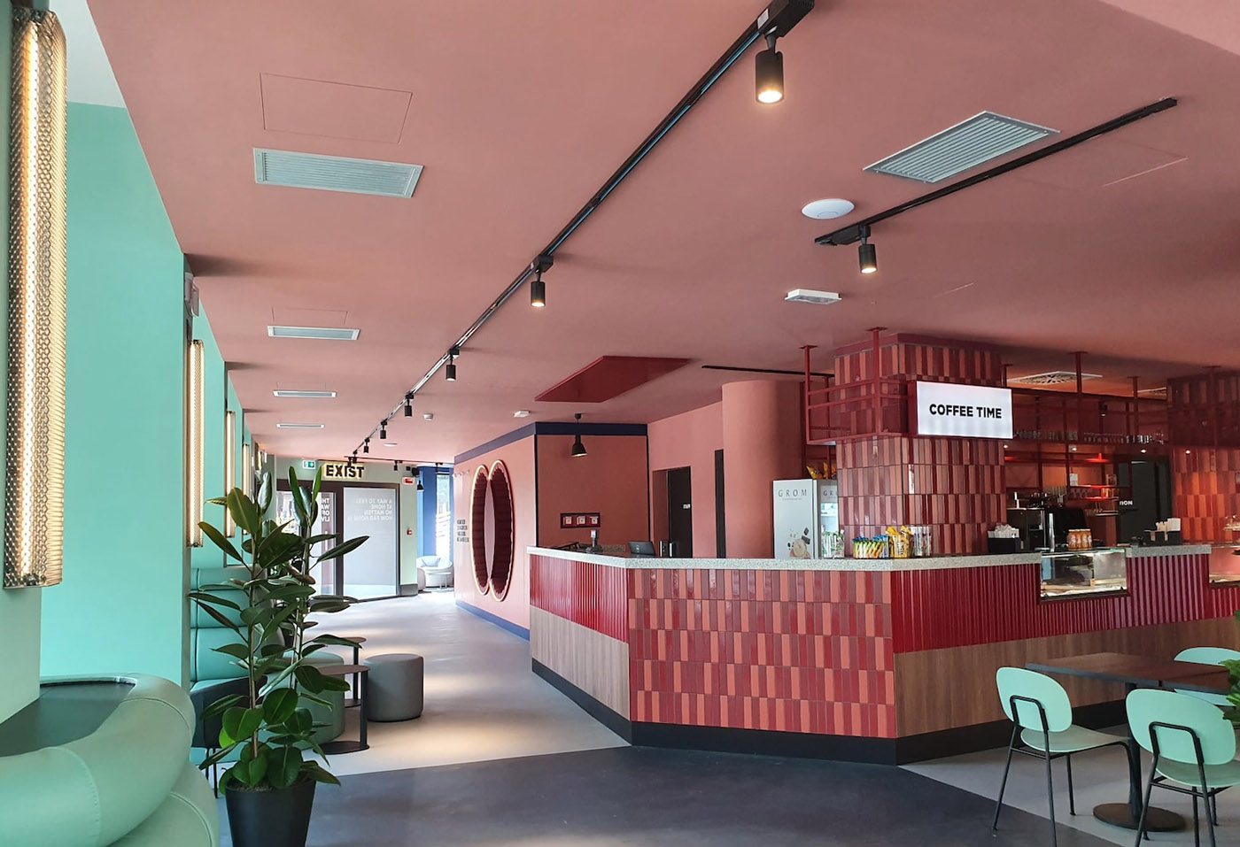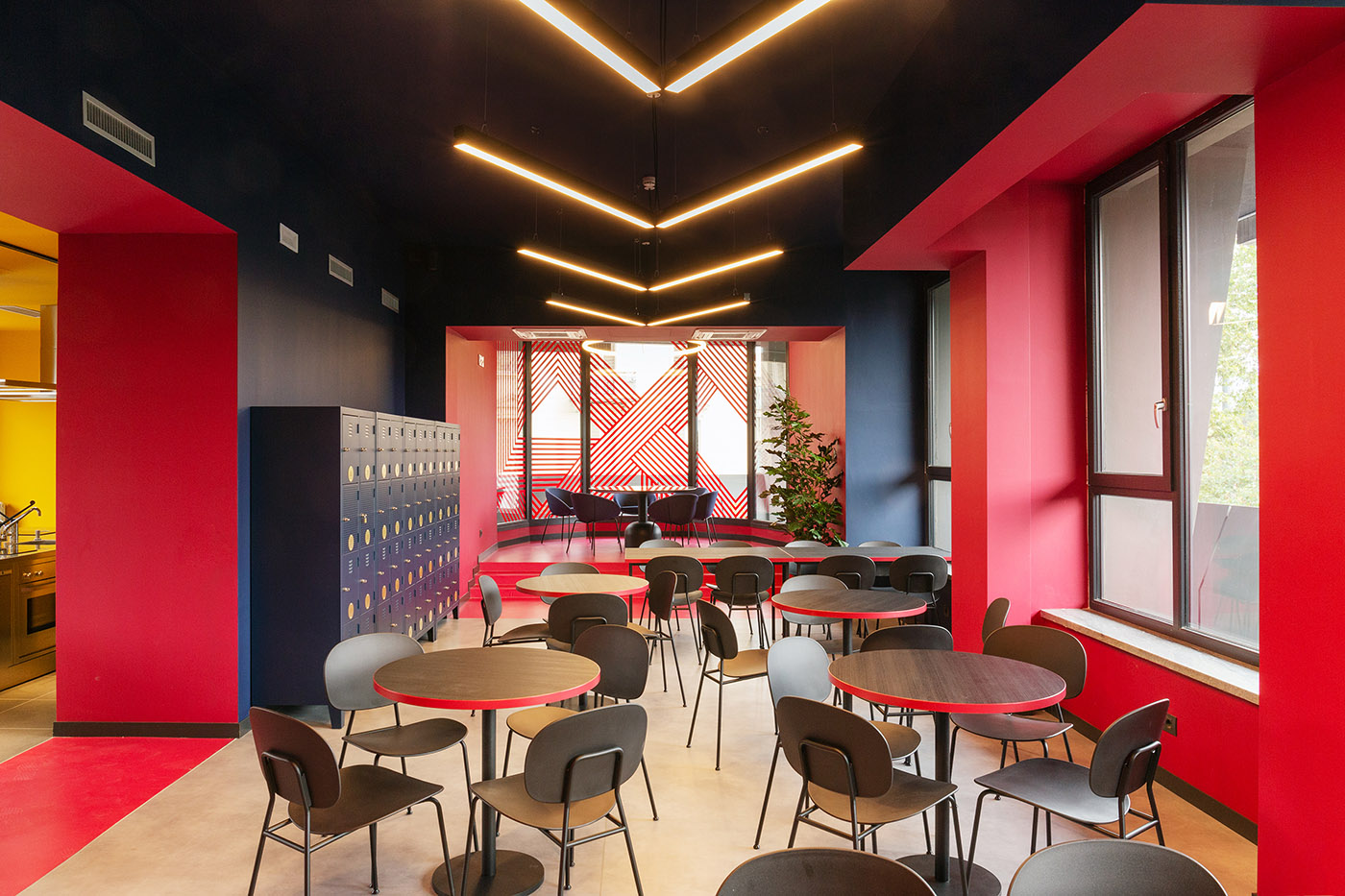 La intención inherente en el proyecto de interior para el CX Turin Regina es crear una nueva comunidad que use los espacios comunes de manera libre y flexible: en la planta baja, la cafetería con zonas de descanso y mesa comunitaria, el gimnasio y la sala de estudio se presentan como el dualismo de Corpore & Mens (Cuerpo & Mente); en el segundo piso, la cocina común y la terraza para los descansos de almuerzo de los estudiantes, y al subir, la azotea panorámica en el 8° piso desde la cual se puede disfrutar de una vista impresionante del río Po y las colinas de Turín
