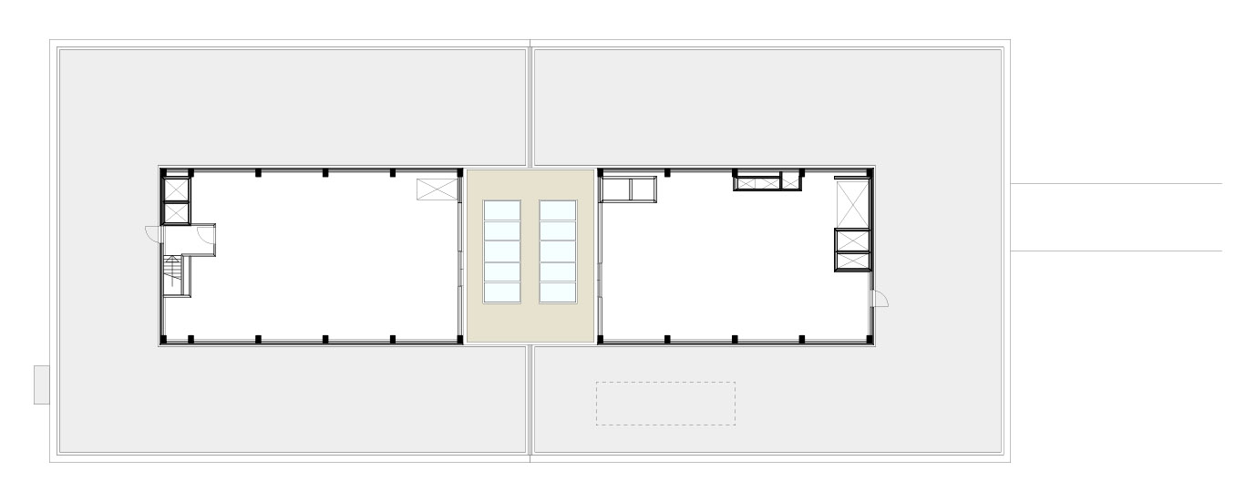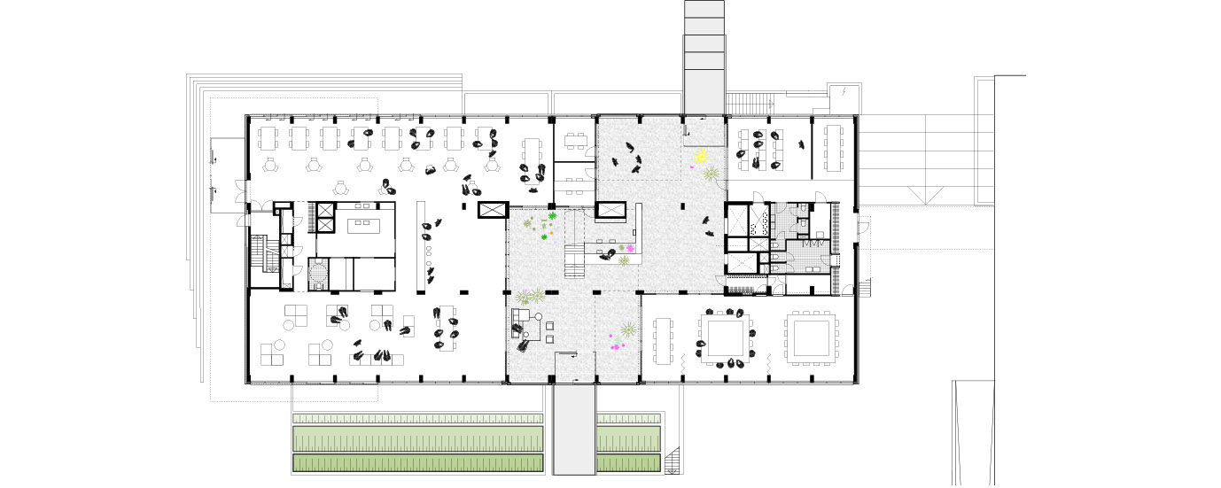 L'intervento principale rimuove pavimenti e rivestimenti. Tra il telaio di calcestruzzo è stato aperto un ampio atrio al centro dell'edificio, alto quattro piani. Questo spazio diventa il nuovo nucleo sociale attorno al quale ruotano le diverse funzioni. Su ogni piano si legge l'impronta dell’atrio e la facciata “ritagliata” a zig-zag tra il telaio in calcestruzzo ed i nuclei dei servizi fissi. Questo si traduce in un atrio dinamico con balconi sovrastanti, marciapiedi, luoghi panoramici e vuoti, che si completa con l'interazione tra le sezioni aperte e chiuse della struttura in calcestruzzo a vista