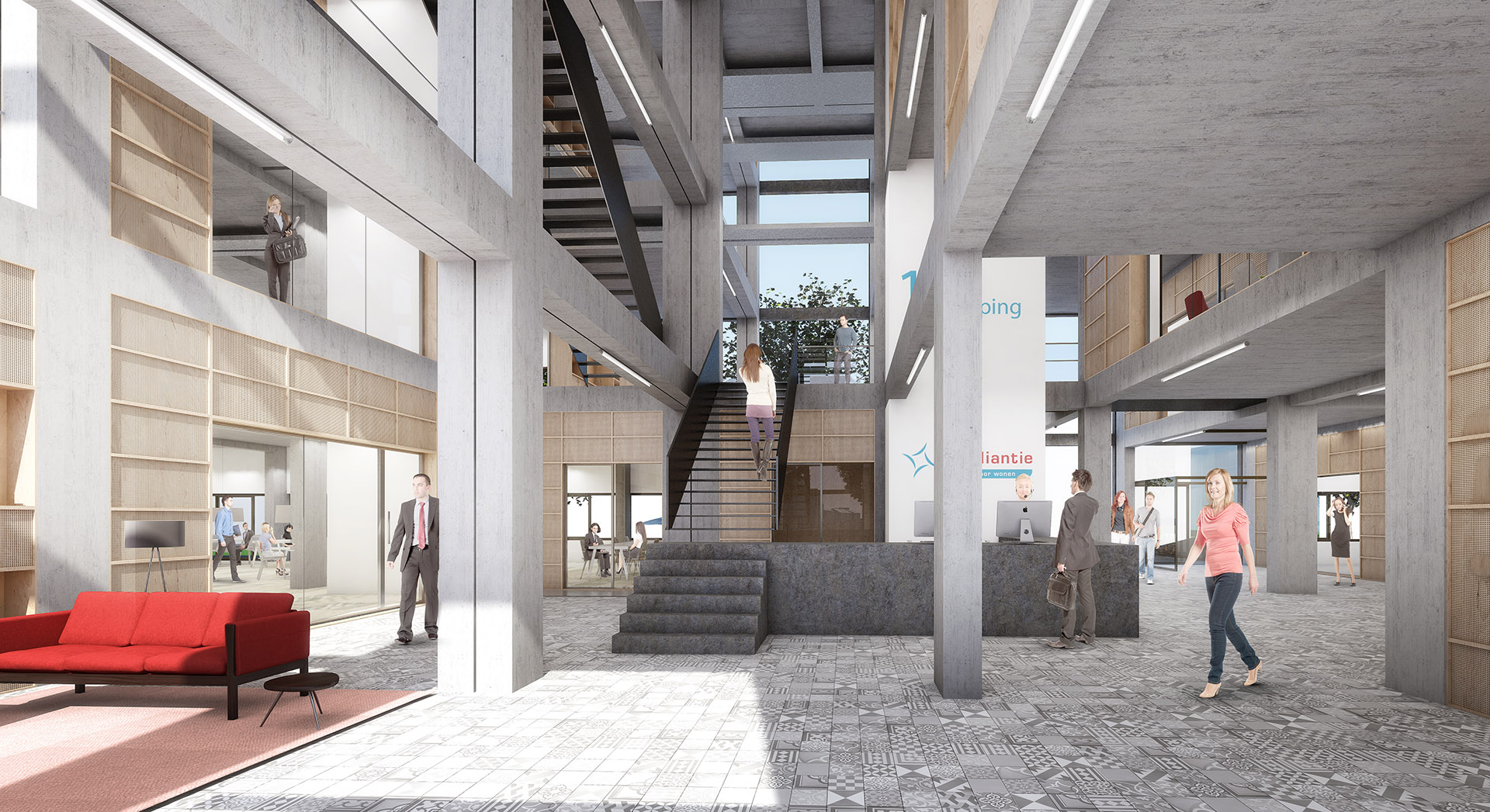 Il pavimento a mosaico di grandi dimensioni accentua ulteriormente questa vivacità. Aperture interne invitano gli uffici al dialogo e l'atrio sempre con nuove sezioni in facciata porta la luce del giorno nell'edificio. Questi ritagli a zig-zag lungo il telaio in calcestruzzo offrono scorci dominanti all’interno della società, in particolare quando questa è illuminata di notte. Nuovi accessi facilitano un percorso diagonale attraverso l'edificio. L'intera facciata sarà dipinta di nero. Con questa nuova trasparenza e la connettività con gli esercizi di ristorazione al piano terra pianificate, l'edificio acquisisce una chiara valenza pubblica