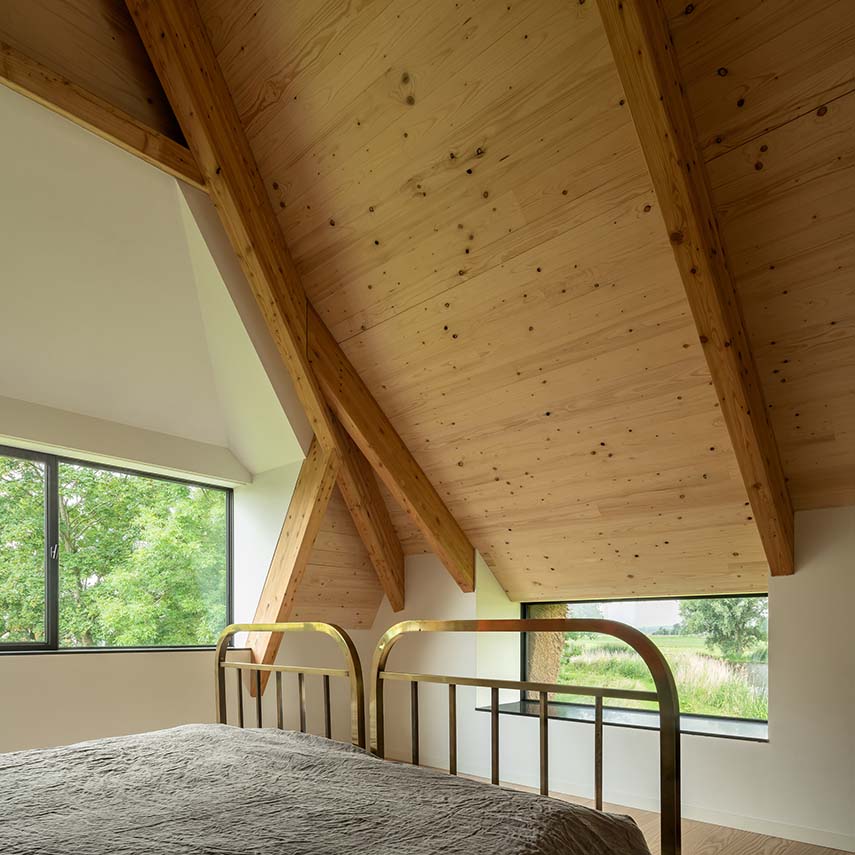 Mirck Architecture al diseñar la nueva Casa Dike utiliza las maravillosas vistas disponibles, la luz natural y la madera. Mirck propone abrir el espacio habitable hacia el norte, rompiendo el volumen de la casa en el lado opuesto al dique, mirando hacia el paisaje de pólder. El rincón exterior de la nueva abertura está completamente acristalado y permite que entre mucha luz natural en el amplio espacio abierto, creando la sensación de ser parte del paisaje.