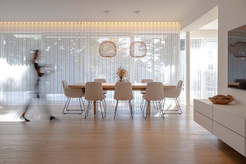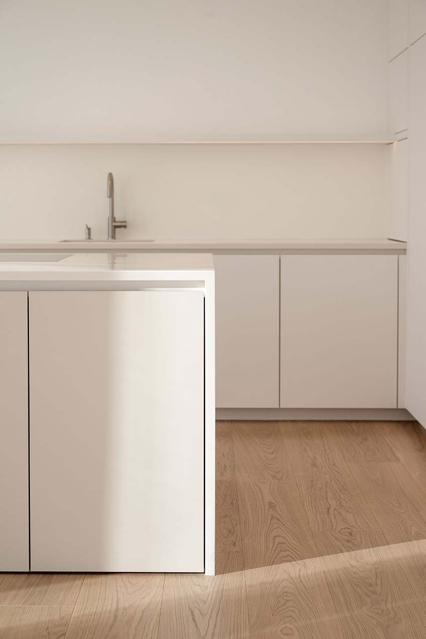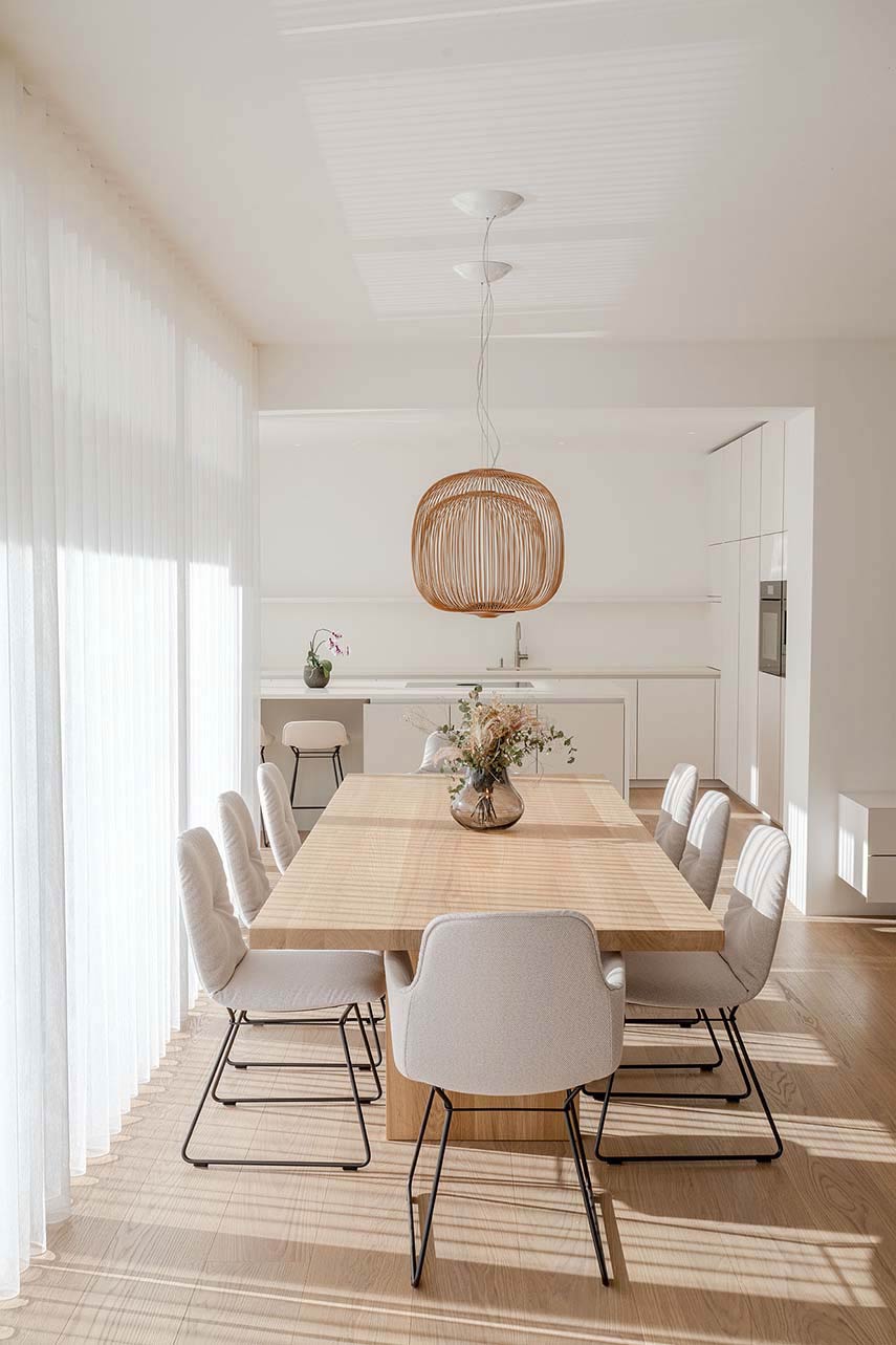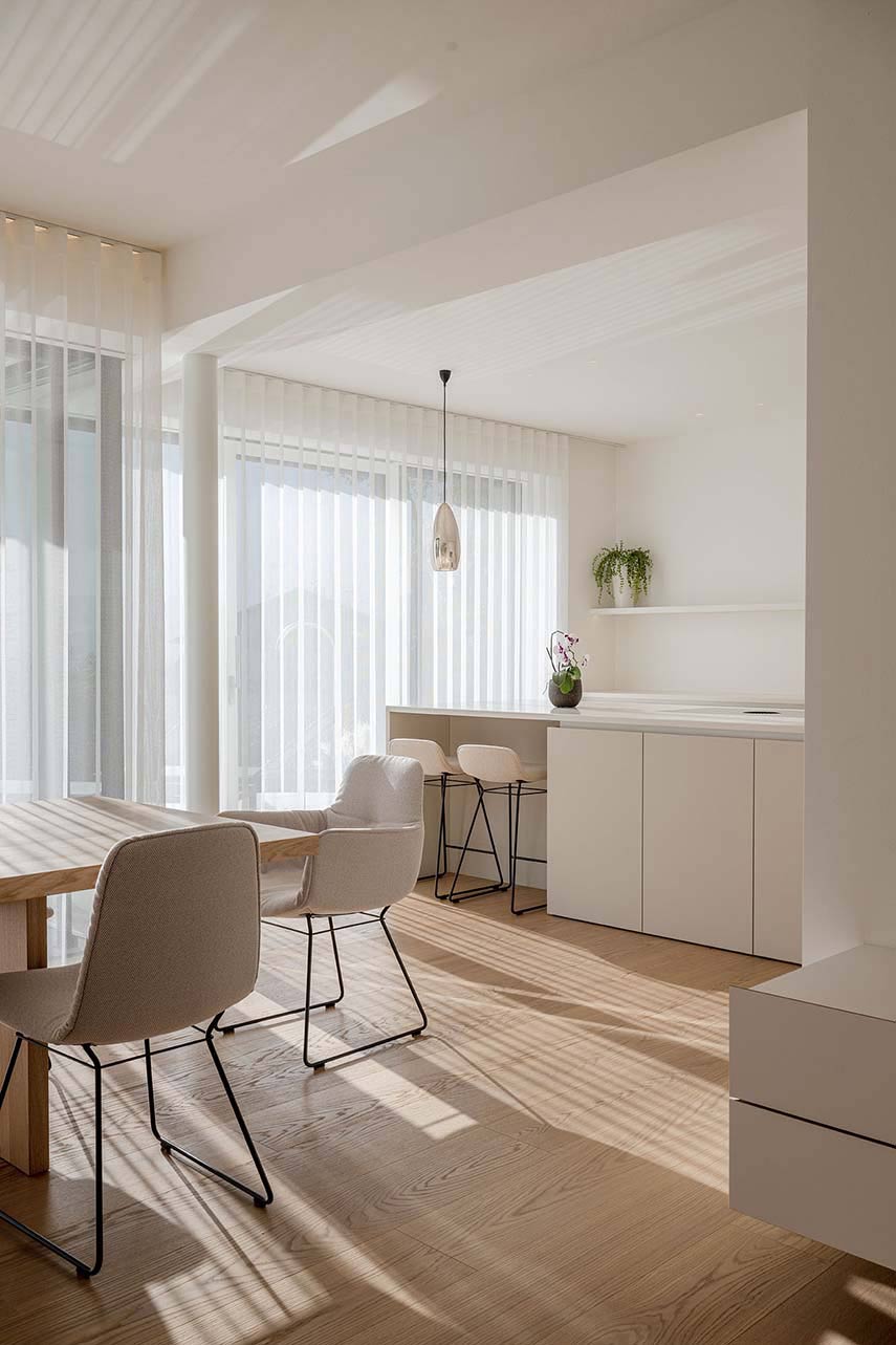 Monovolume architecture + design se encarga de la renovación de la Casa T2 con un enfoque que busca crear una conexión entre el interior de la vivienda y el jardín con piscina. La primera invitada en casa es la luz que reina como protagonista, amplificada por las paredes blancas y los tonos claros de los muebles y materiales: así, el amplio espacio de estar se abre para recibirla a través de la gran ventana que lo conecta con el jardín, en una agradable armonía entre interior y exterior
