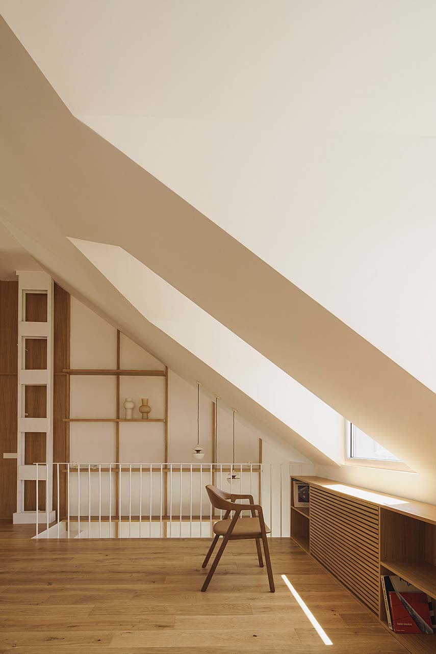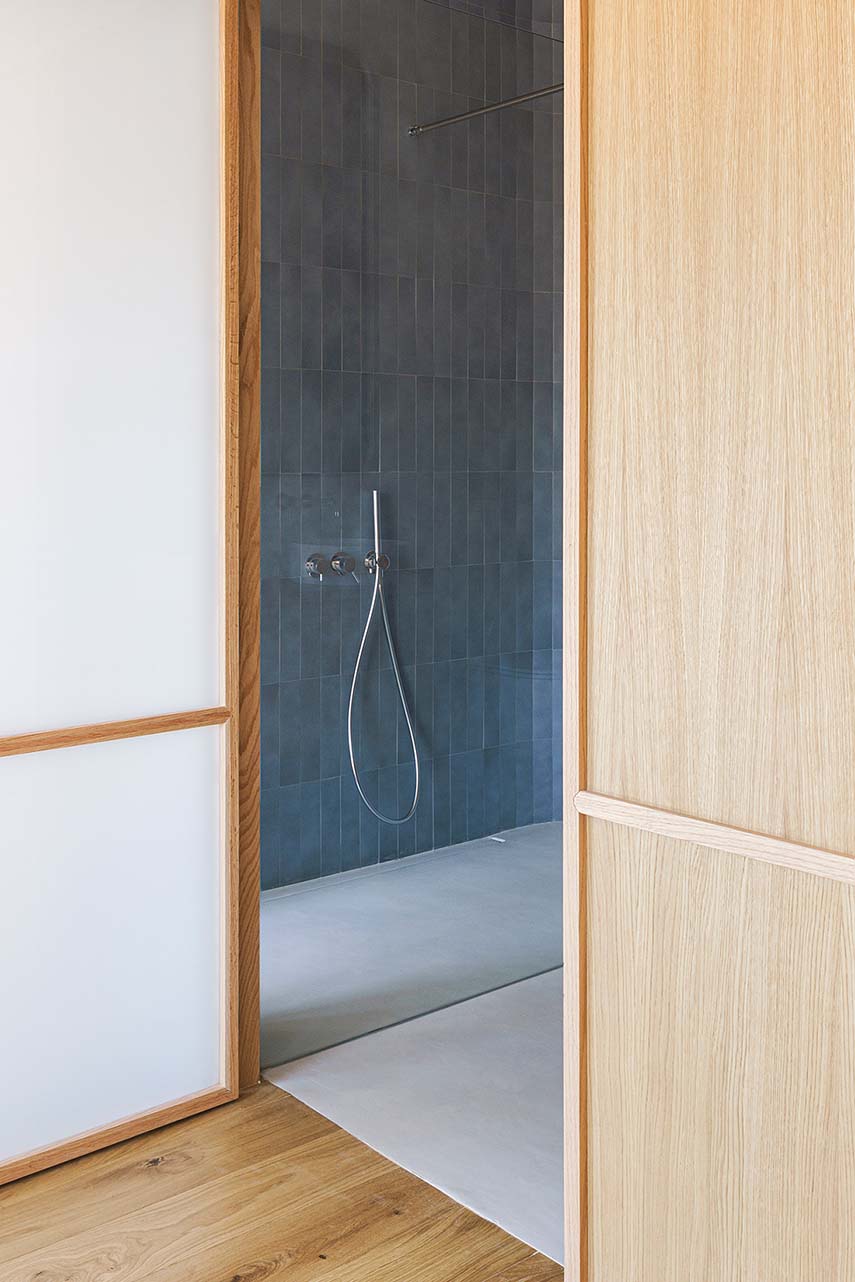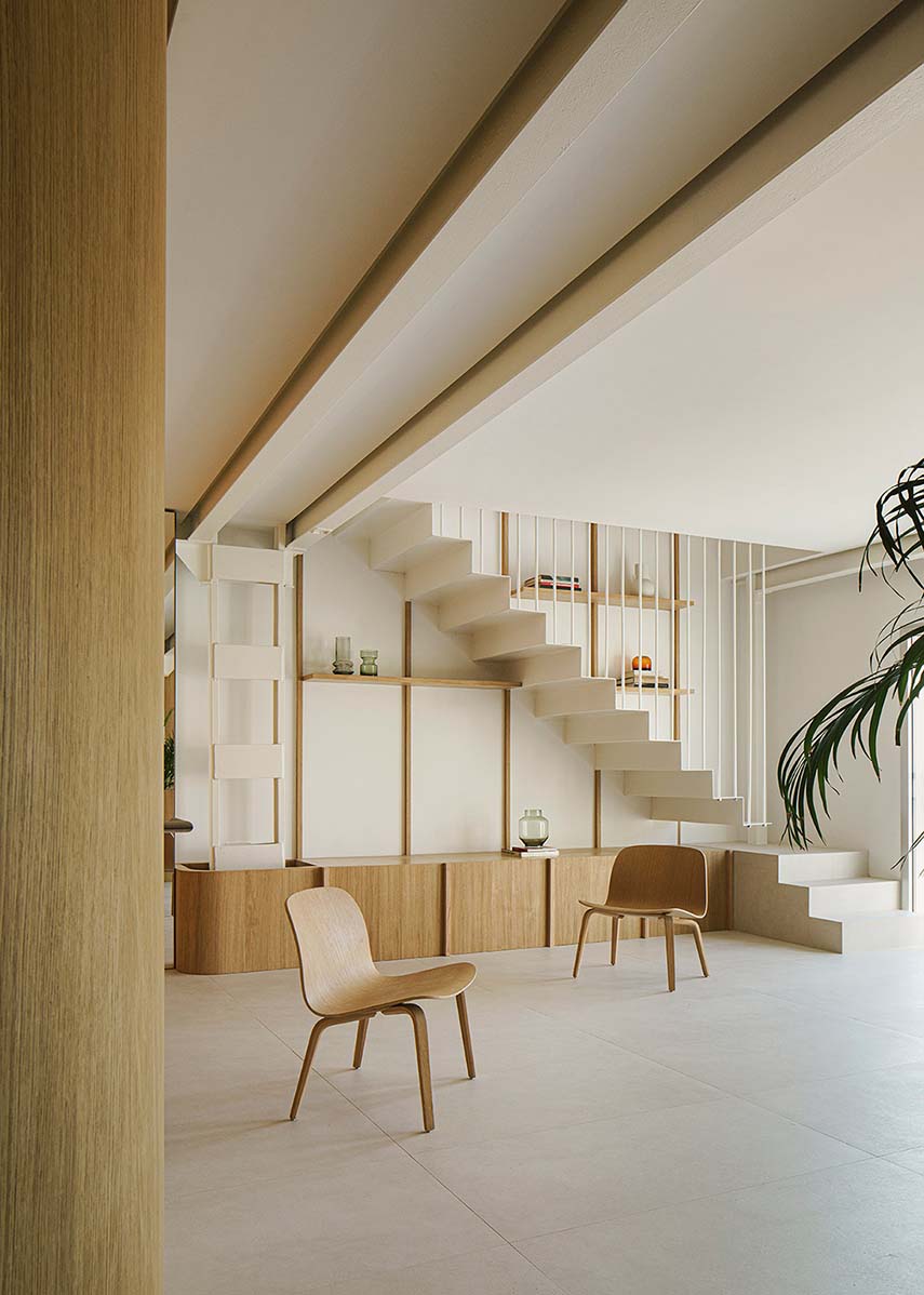 Las texturas de la madera en los elementos verticales y la cerámica del suelo otorgan al espacio un carácter singular y un hilo conductor en el lenguaje diversificado de las plantas arquitectónicas. Los volúmenes de carpintería en madera de roble articulan las zonas diurnas y ocultan las áreas nocturnas, más privadas. Utilizados como filtro, proporcionan continuidad espacial y material a la vivienda