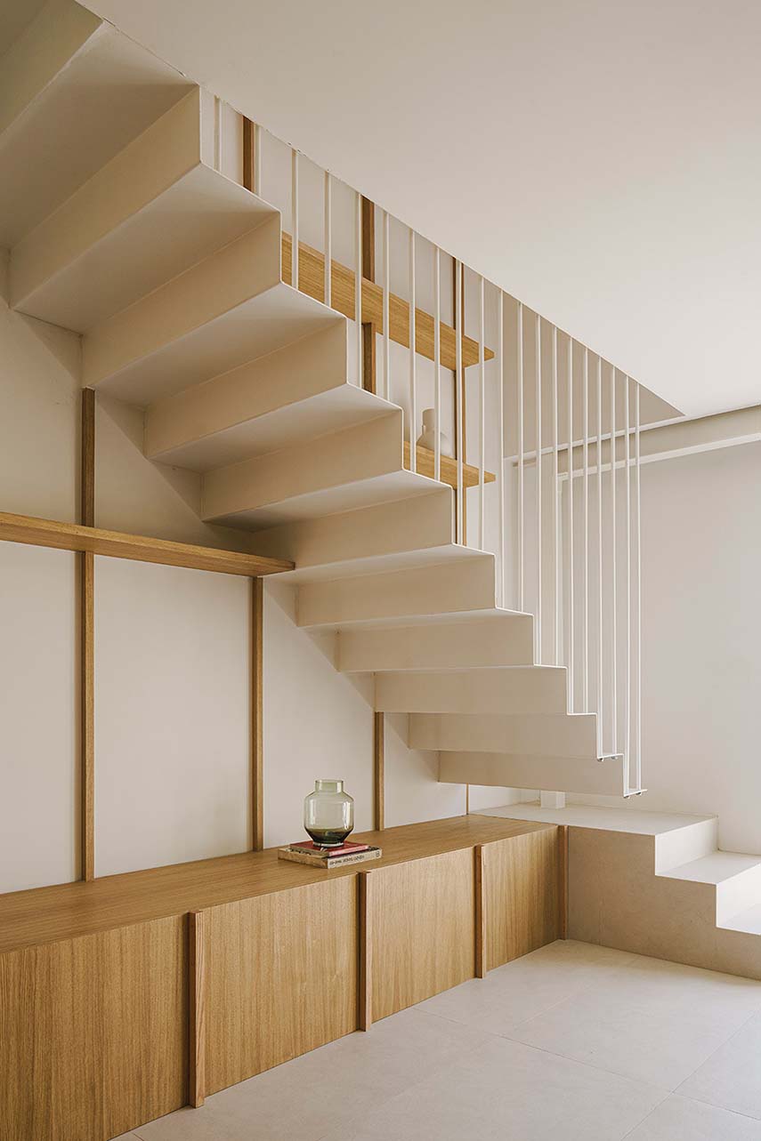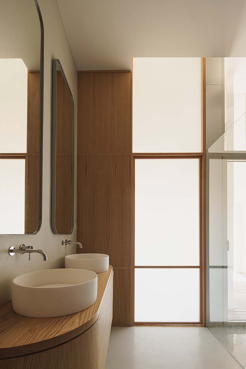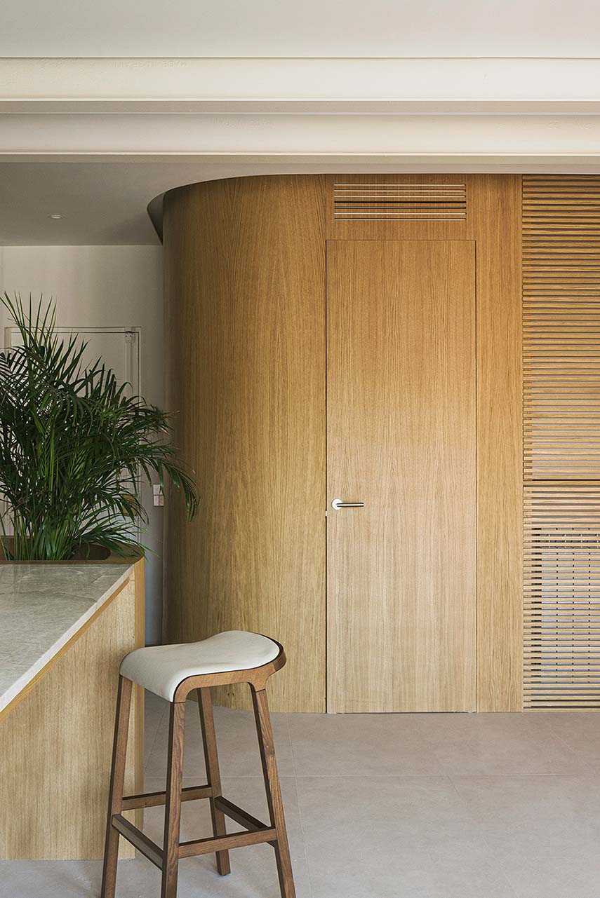 Las texturas de la madera en los elementos verticales y la cerámica del suelo otorgan al espacio un carácter singular y un hilo conductor en el lenguaje diversificado de las plantas arquitectónicas. Los volúmenes de carpintería en madera de roble articulan las zonas diurnas y ocultan las áreas nocturnas, más privadas. Utilizados como filtro, proporcionan continuidad espacial y material a la vivienda