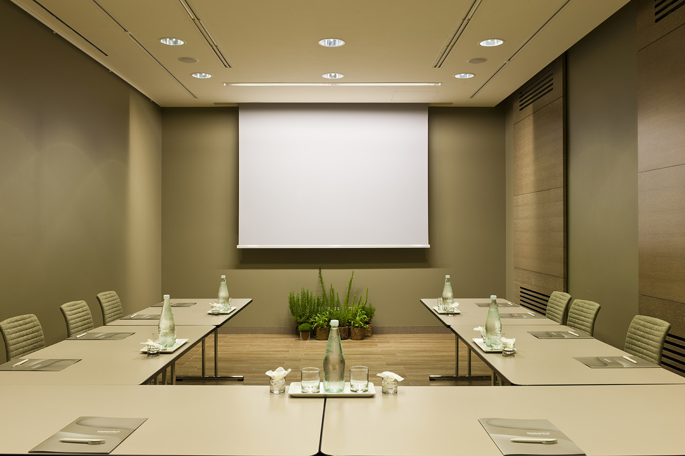 La zona de recepción está inmersa en la luz y el tiempo: un techo retroiluminado simula las horas del día y ofrece el espectáculo del amanecer, el atardecer y la noche, siguiendo los ritmos naturales de la luz. El punto de apoyo y el alma del hotel es una gran pared central, que va desde el vestíbulo hasta el restaurante, gracias a la cual uno tiene la sensación de vivir en el verde