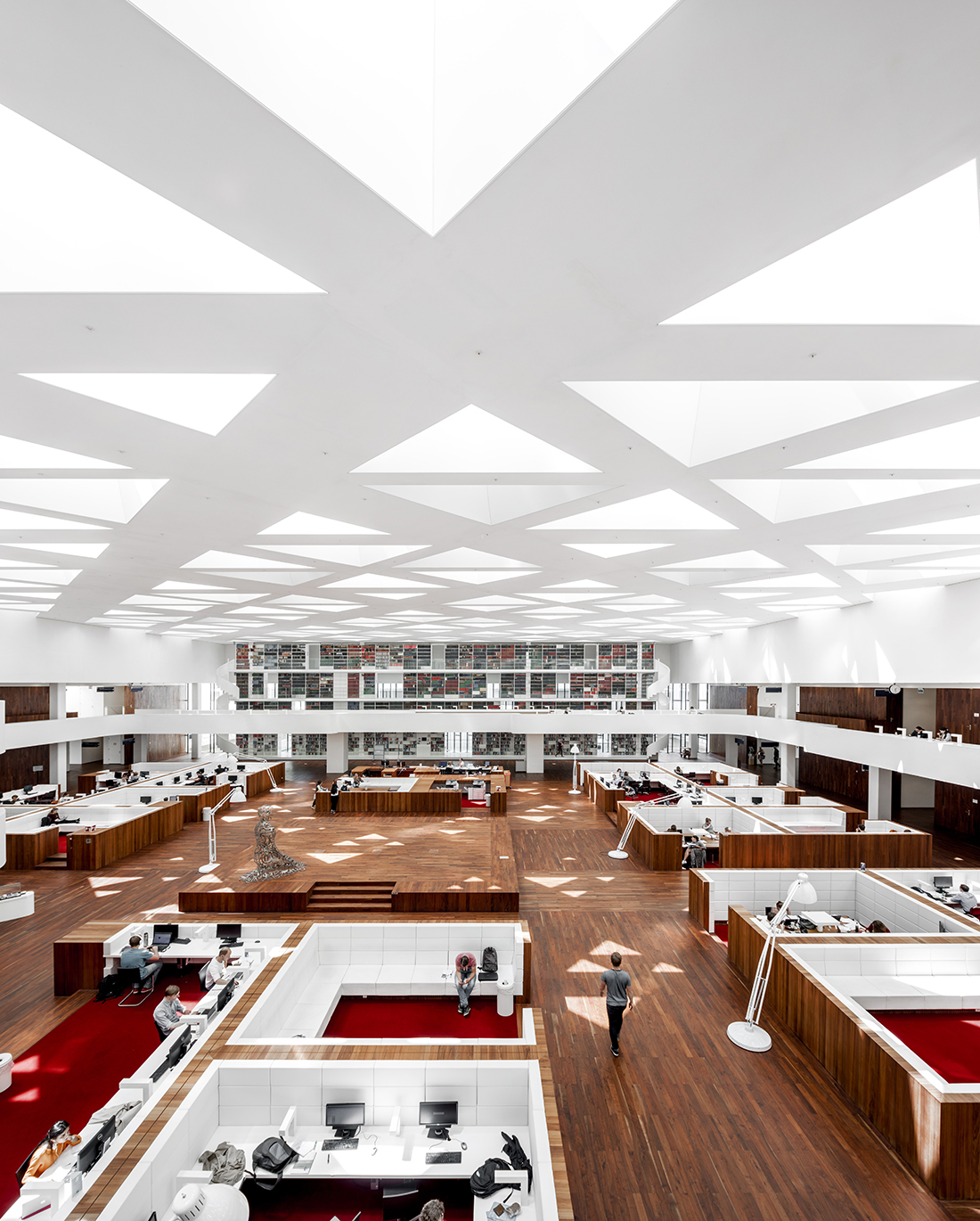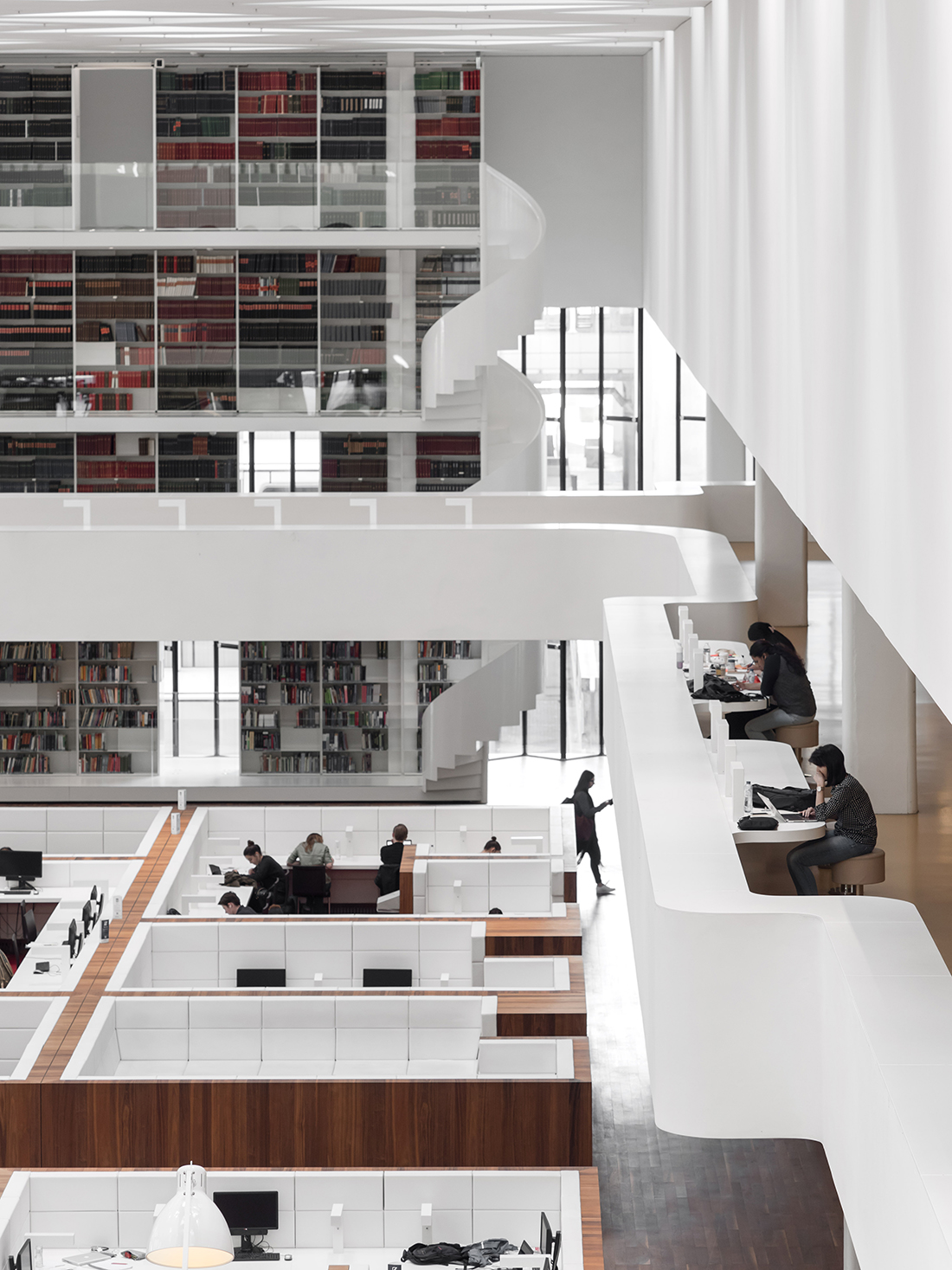 El atrio, sobre el que se articula el proyecto, contiene áreas de estudio integradas, en las cuales los módulos de mobiliario han sido diseñados para acoger grupos de estudio. La alfombra roja corre a lo largo de los pasillos y, junto con los bosques de nogales oscuros, crean un ambiente discreto, delimitado por una estantería de 35 metros de largo y cuatro pisos de altura. Frente a este gran muro, se abren las aulas. La plaza desemboca en el atrio, caracterizado por tanto una gran ventana comouna gran terraza al aire libre. Más allá de la ventana, los pasajes que corren alrededor del borde de la parte superior del cuadrado permiten el acceso a las aulas