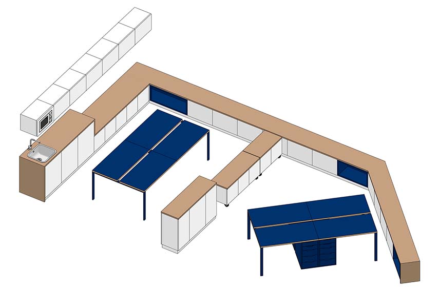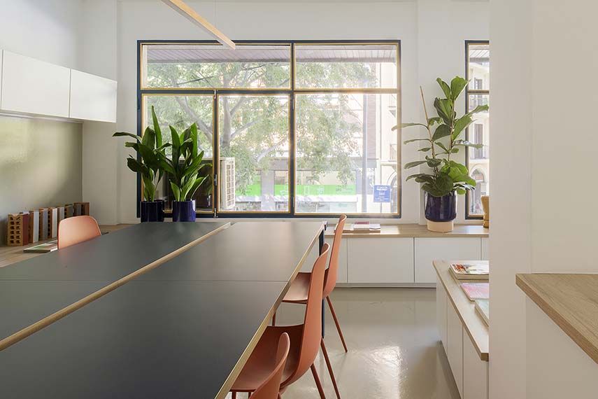 Situado en el entrepiso de un edificio residencial de 1960, este espacio solía albergar un almacén textil. El edificio refleja la típica estratificación funcional de la época: actividades comerciales en la planta baja, oficinas y laboratorios en la planta principal, y viviendas en los pisos superiores. Un espacio histórico repensado, como vemos también en otros proyectos de arquitectura, para dar cabida a un ambiente de trabajo abierto, luminoso y funcional.