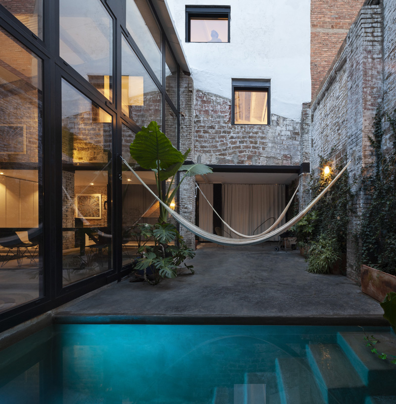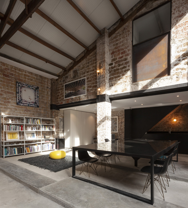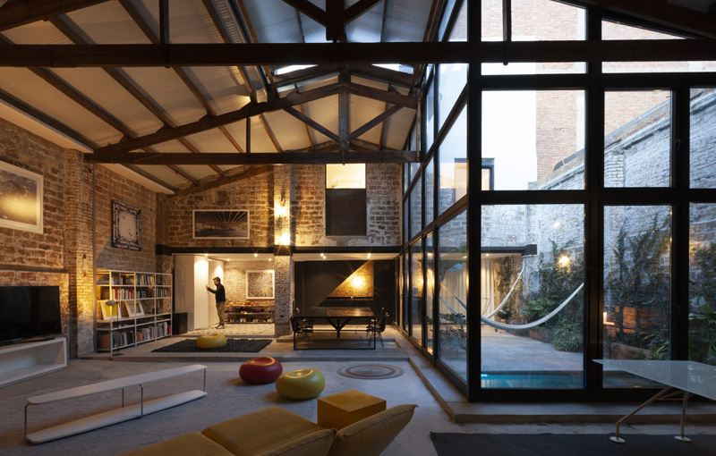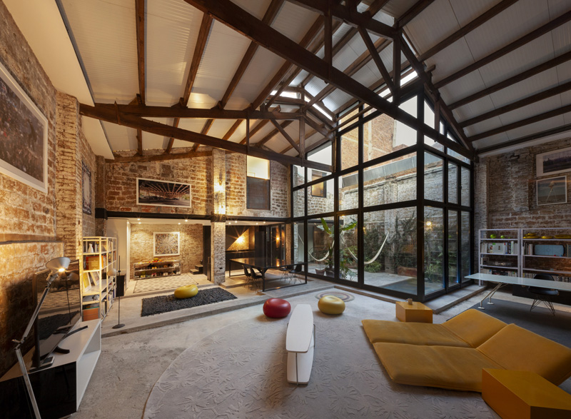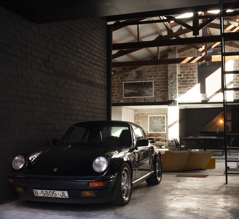 Los estudios incluyen un espacio de doble altura. En la entrada de la casa hay un espacio reservado para un coche de época entendido comouna escultura. Es una obra de arte en relación directa con el espacio central de la casa, un gran espacio central ocupa el corazón de la casa. El comedor, la cocina, la sala y el estudio comparten un espacio continuo y acogedor gracias a la acumulación de usos, objetos y las texturas de sus materiales expuestos: metal, madera, piedra y ladrillo