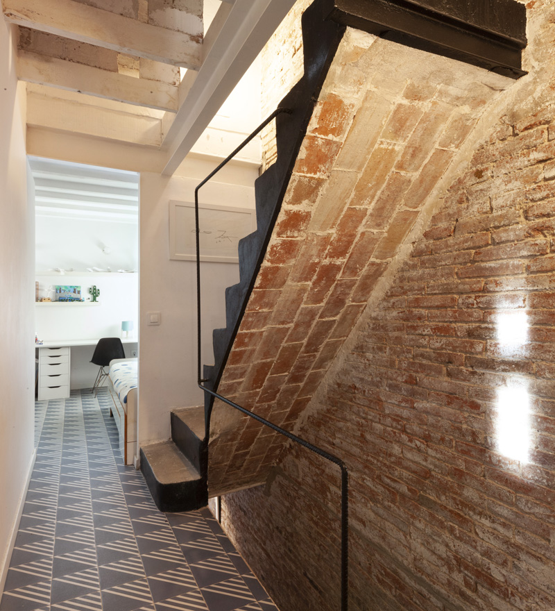 El área de entrada prevé una pequeña habitación dividida en 3 espacios independientes: 2 estudios a los lados con acceso a la casa en el centro. Los estudios están iluminados gracias a dos grandes ventanales, gracias a los cuales los interiores tienen una relación directa con la calle y es posible recuperar la fachada original del teatro
