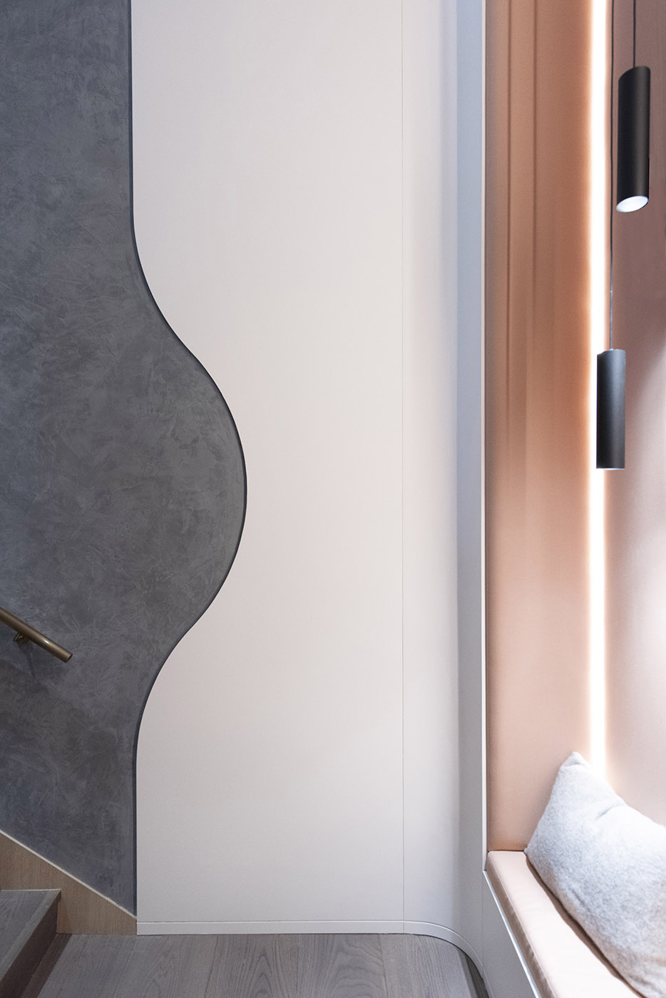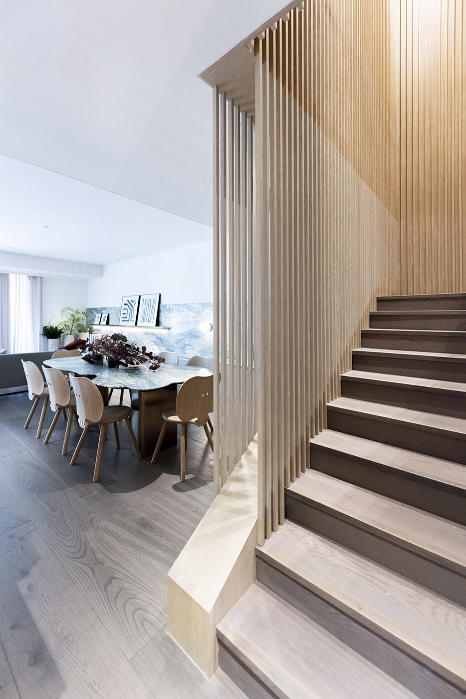 Per creare un senso di movimento, verticalità e continuità sulle pareti si è optato per l'uso di doghe in legno a tutta altezza su superfici curve, creando un senso di calore e intimità. Le doghe continuano anche nel corpo scala, creando continuità tra i due piani