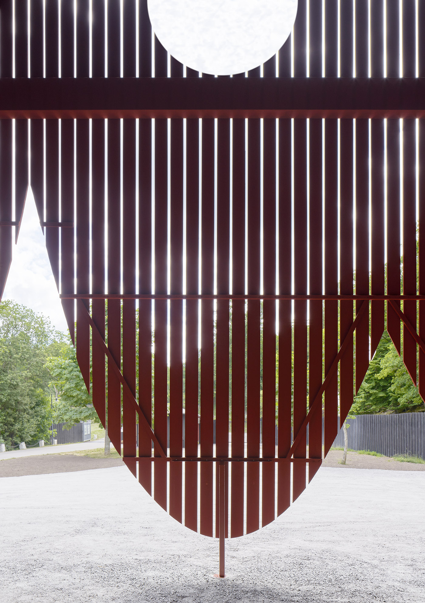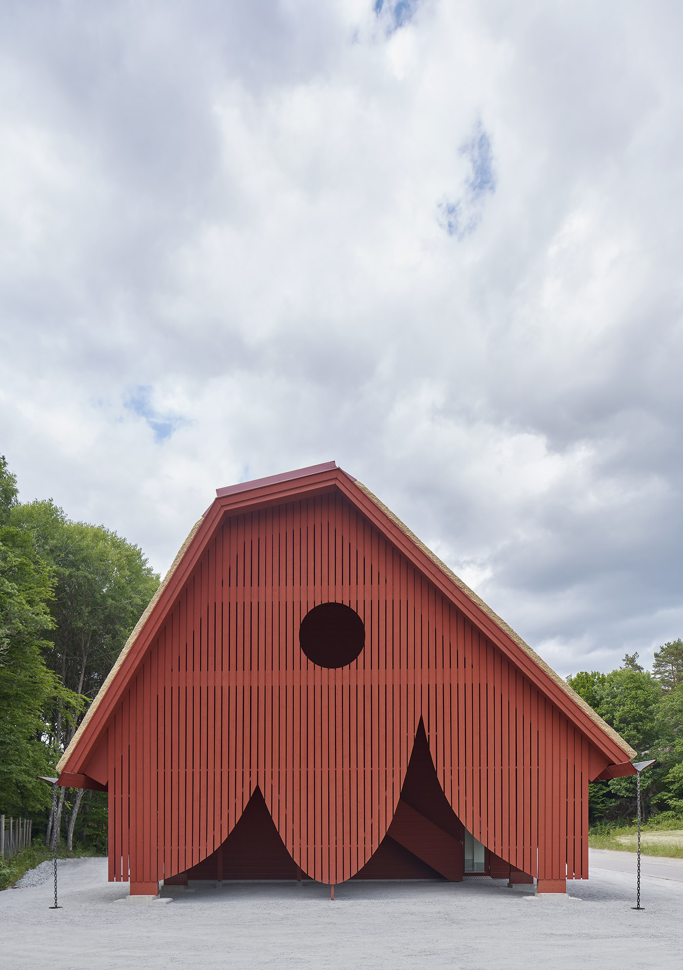 Originalmente, la entrada a la reserva natural de Eriksberg no estaba muy bien delimitada, hasta el punto de que muchas veces los visitantes vagaban confundidos por la zona. Por lo tanto, era necesario reforzar urgentemente la identidad del lugar para ofrecer a los visitantes no solo claridad, sino también una primera impresión acogedora de la reserva. Así nació la idea de esta inesperada fachada en forma de carpa que sorprende y da la bienvenida al visitante, introduciéndolo en la reserva