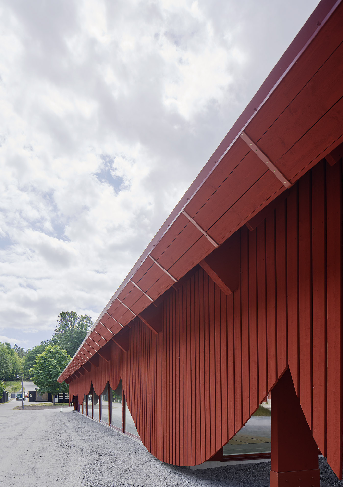Un llamativo edificio de entrada a la reserva natural de Eriksberg, con una fachada de formas inusuales decorada con la tradicional pintura sueca "Falu rojo cobre", es la primera de una serie de intervenciones para el Eriksberg Hotel &Nature Reserve
