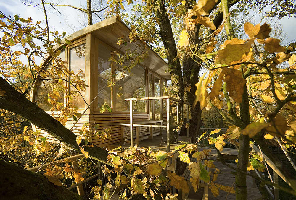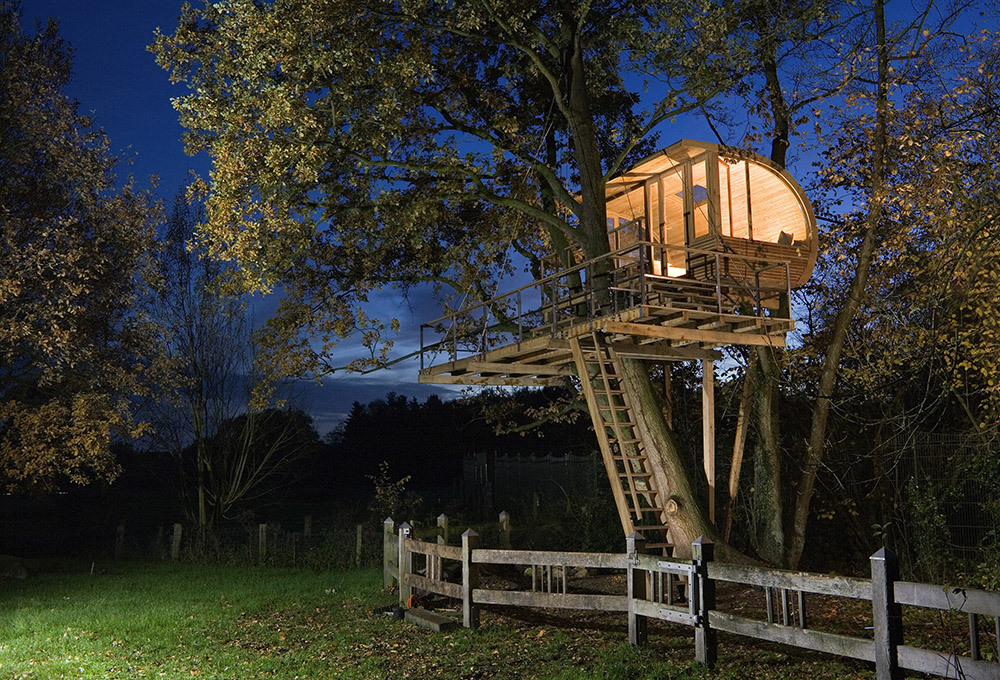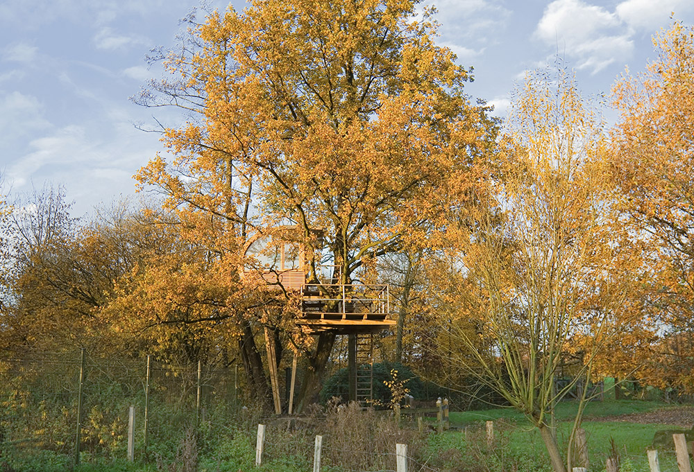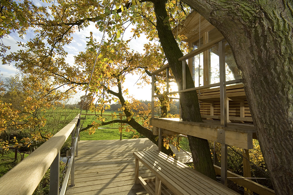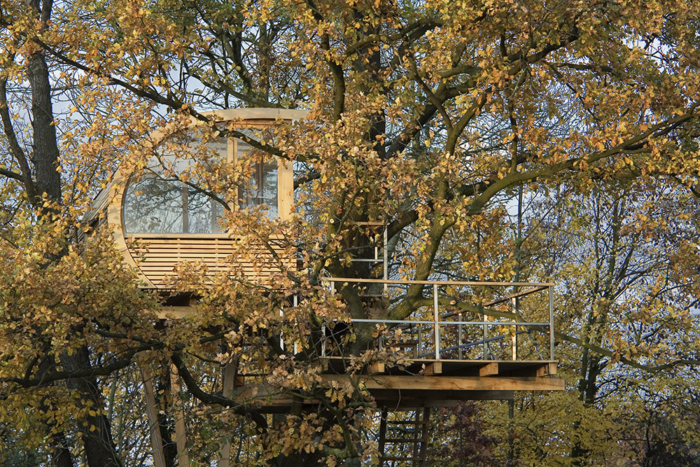 En Osnabrück, en el espacio en forma de V entre un aliso y un roble, el estudio Baumraum ha diseñado una casa en el árbol junto a un pequeño arroyo, abierta al suroeste y con vistas a los árboles y la vegetación, con grandes ventanales y dos terrazas