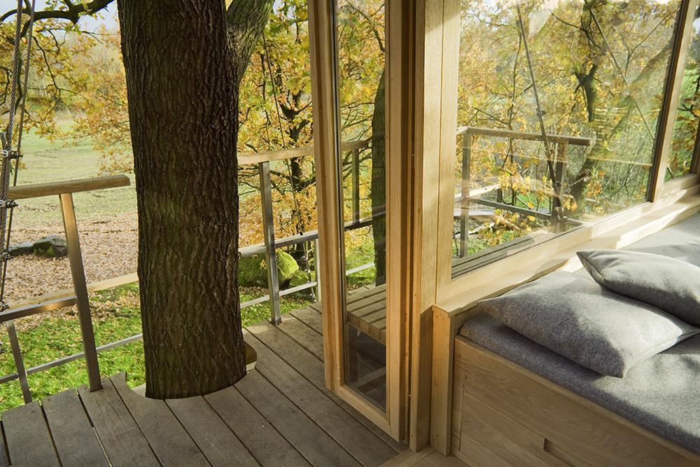 Un banco situado en el nivel superior, protegido por el tejado en voladizo, ofrece un lugar pintoresco para meditar y experimentar de cerca el cambio de las estaciones. El interior está amueblado con roble sin tratar, e incluye una amplia zona de descanso, un banco y un aparador plano