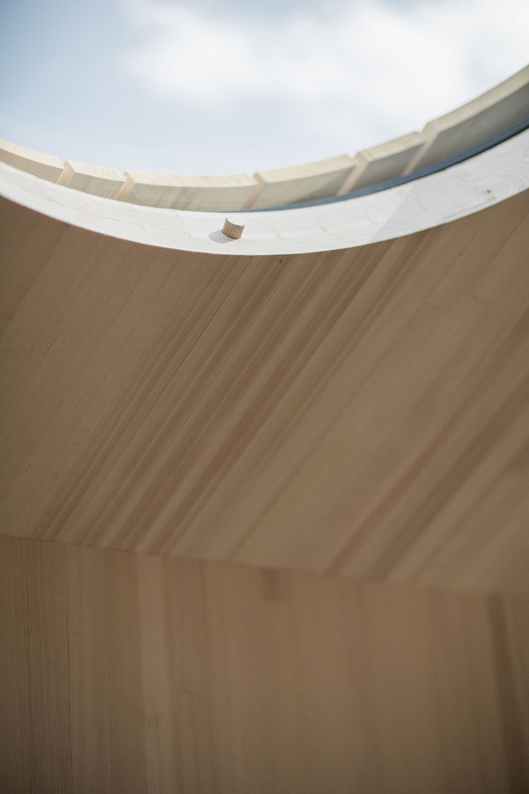 La madera maciza está presente tanto en la construcción como en el interior del pabellón. Las características de las diversas superficies y variedades de madera, abeto rojo, abeto y roble se expresan al dividir el espacio de exposición dentro del pabellón en diferentes áreas de presentación. La madera natural cruda y sin tratar crea una atmósfera relajada, que muestra mejor los efectos positivos de este material de construcción