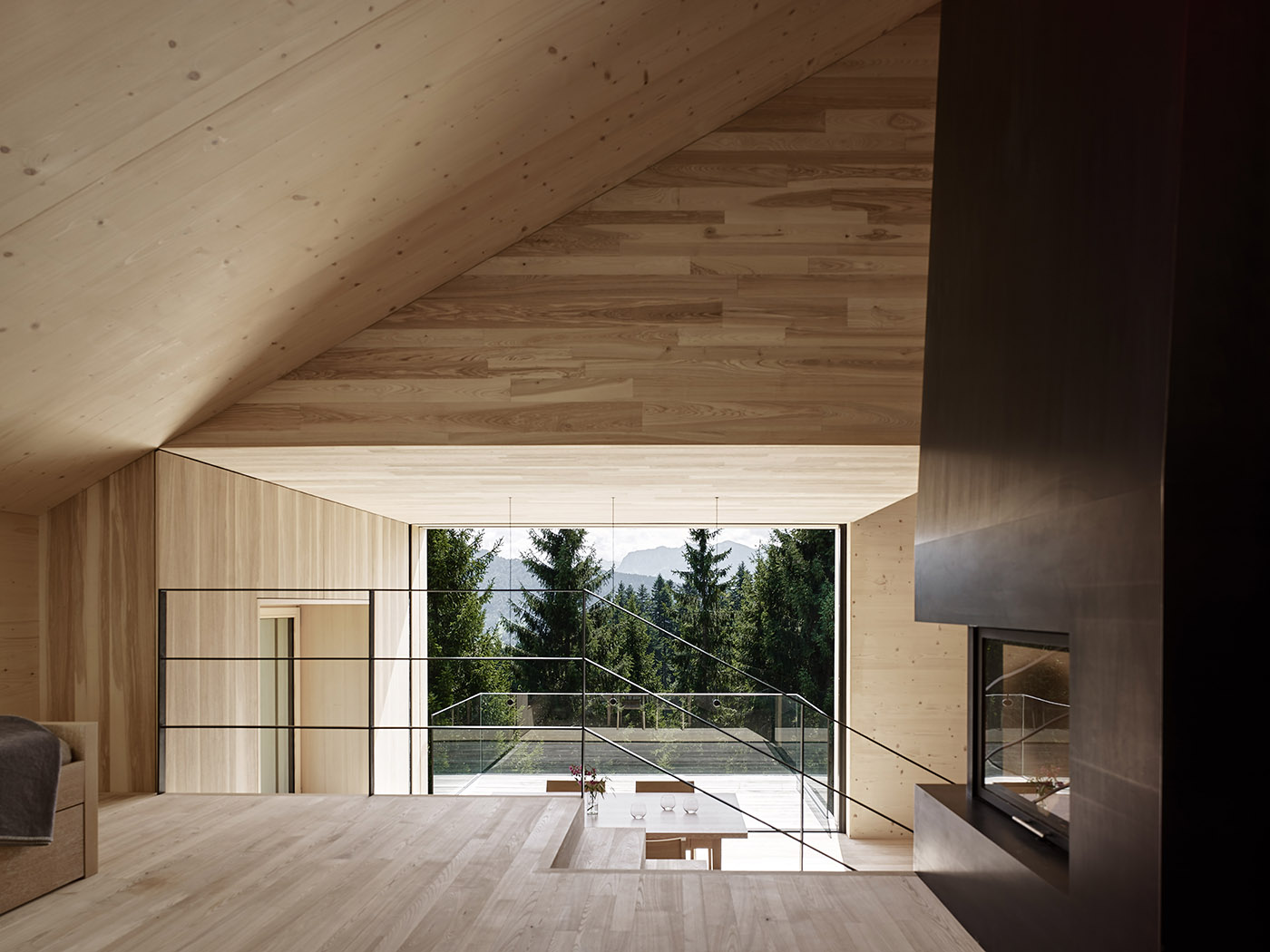 La decisión de utilizar madera maciza ofrecía ventajas estructurales y térmicas, además de crear un ambiente cálido y acogedor. Algunos de los elementos verticales y horizontales de la estructura se prefabricaron siguiendo un riguroso diseño de las aberturas, que se colocaron ad hoc para enmarcar las vistas más emocionantes del bosque circundante