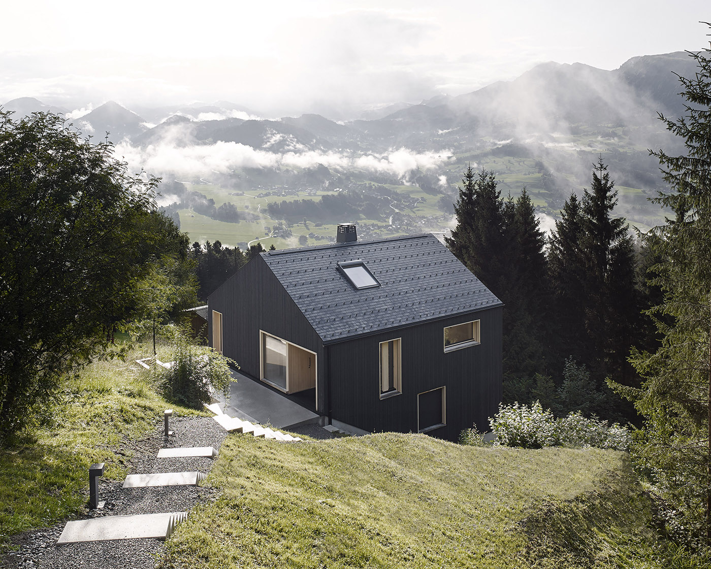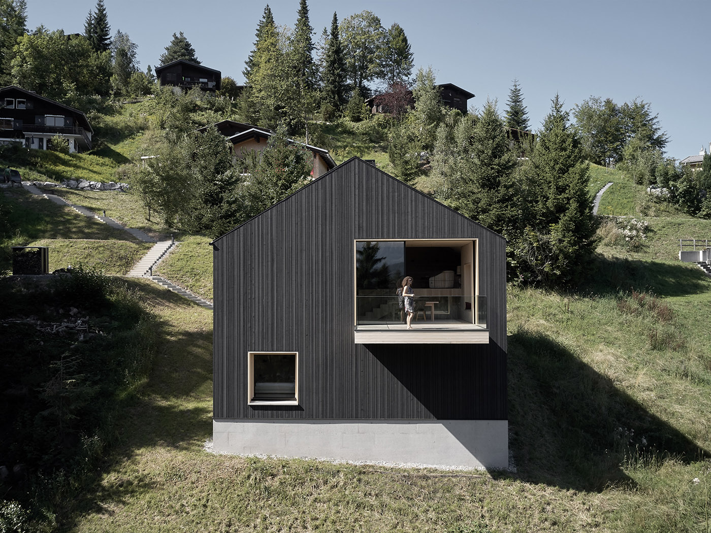 La vivienda solo tiene una vía de acceso posible debido a su ubicación: 70 escalones que hay que subir desde la carretera adyacente. Para garantizar una entrada más adecuada, el edificio se desplazó 1,5 metros hacia el sur con respecto al existente. La base de cemento del edificio se prolonga en una pequeña plaza de entrada delimitada por una fuente al norte. Se creó espacio habitable adicional mediante la construcción adaptada a la pendiente de la parcela. Los distintos niveles también permiten vivir una experiencia única y tridimensional. El cuarto de baño de la planta baja, por ejemplo, recibe luz natural a través de una rendija acristalada bajo la escalera del salón