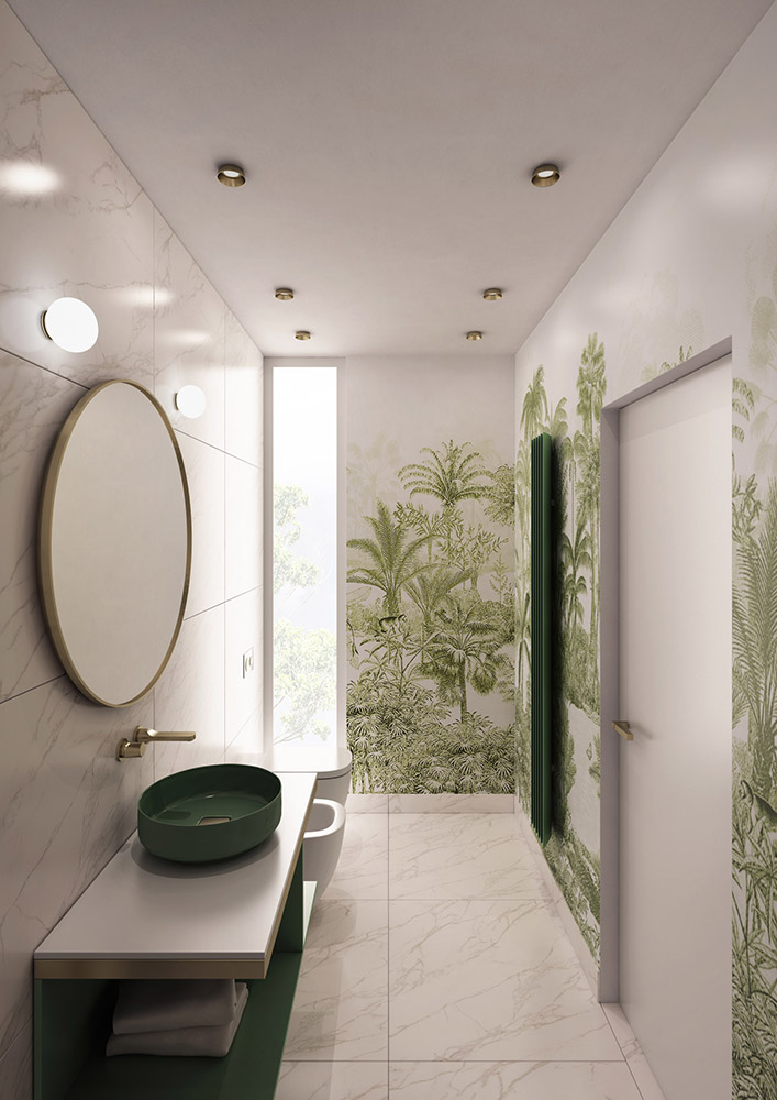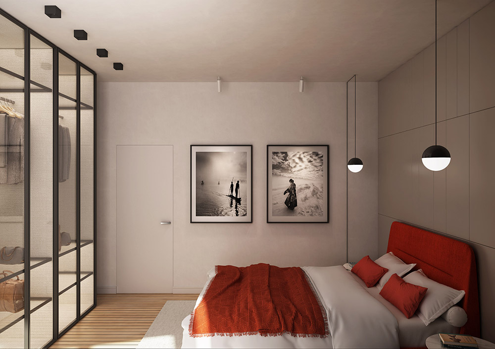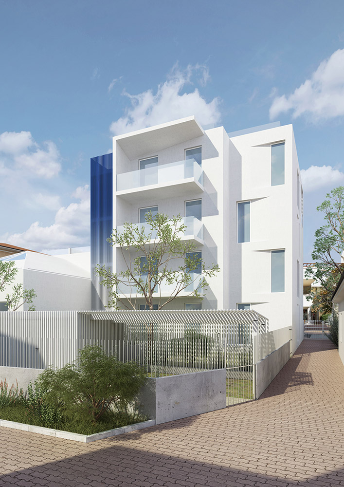 Las fachadas laterales tienen aberturas no ortogonales, ofreciendo vistas privilegiadas del mar. Internamente los espacios se dividen en dos y tres habitaciones, con terrazas, mientras que los apartamentos de la planta baja tienen acceso directo al jardín de la parte trasera del edificio, disfrutando de espacios íntimos y protegidos