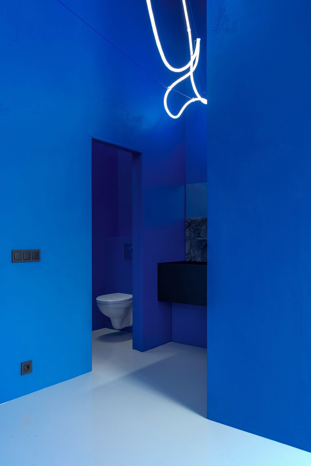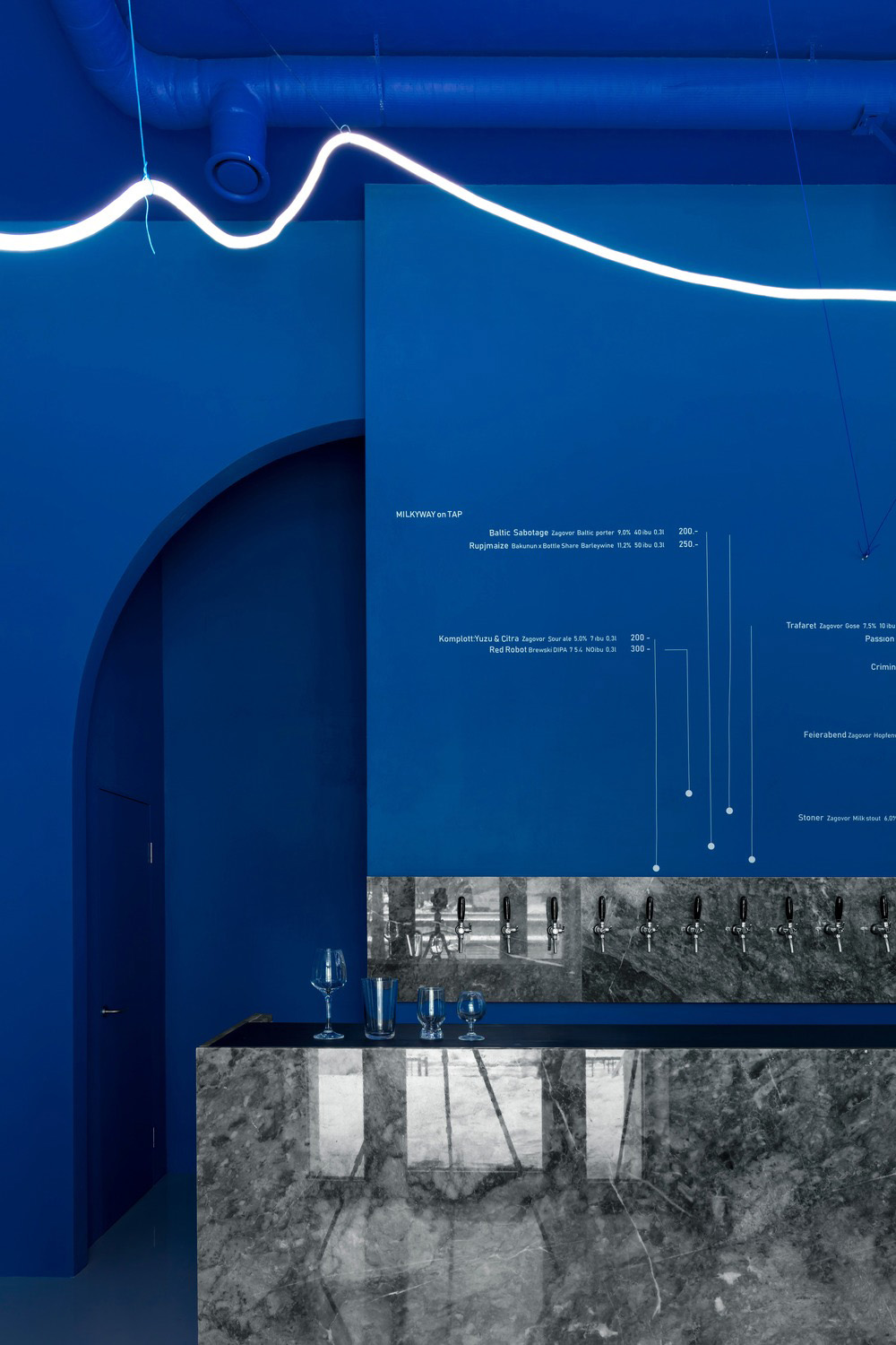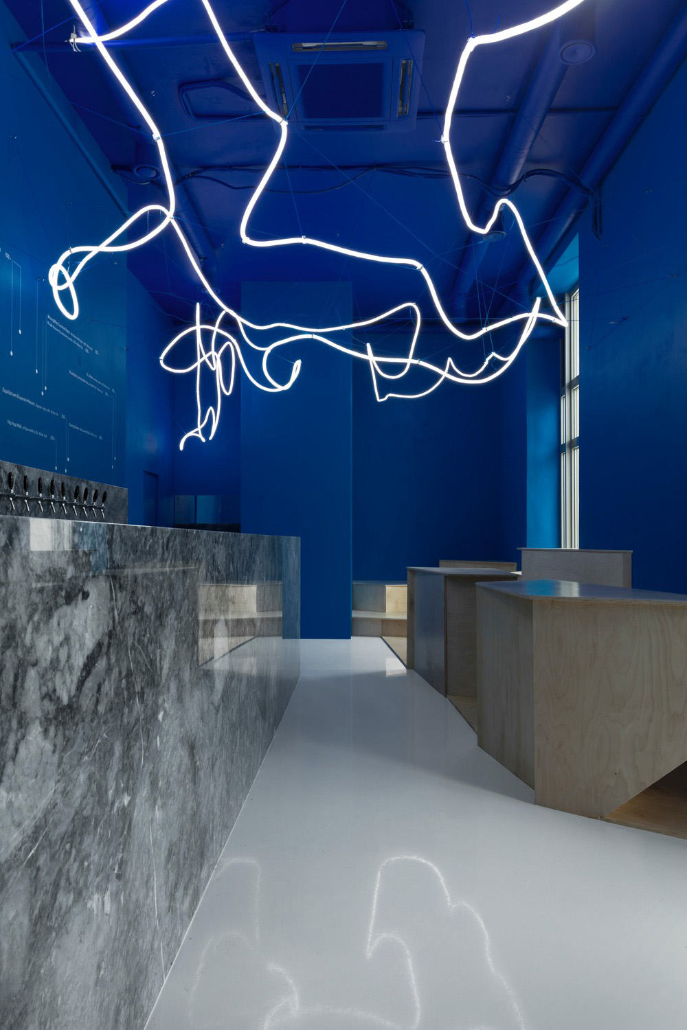 Monoloko design realizza il restyling del Galaxy e Bottle Shop, il locale situato in un edificio neoclassico di Mosca, creando degli interni monocromatici azzurri e forme geometriche che incarnano gli elementi filosofici del "Cosmo Russo"