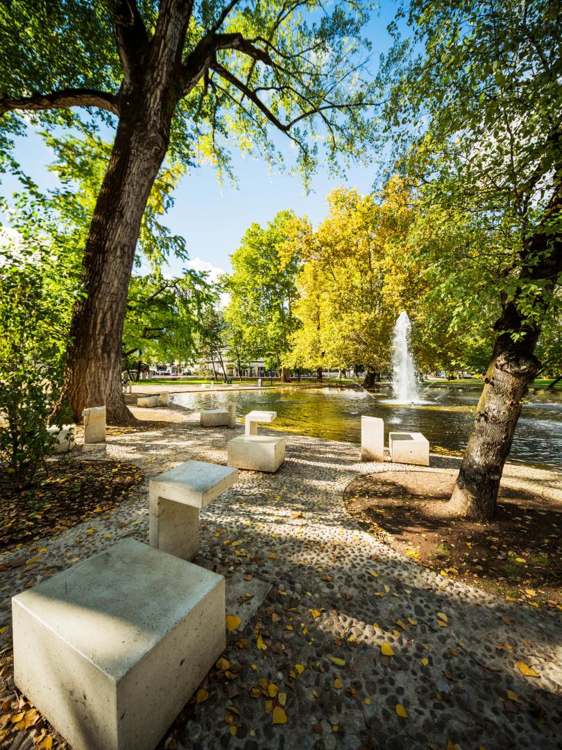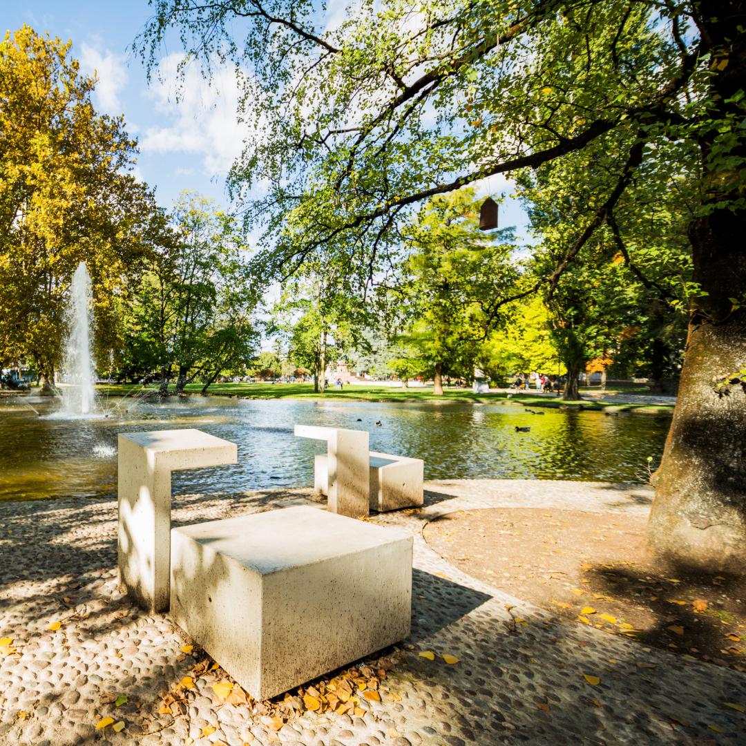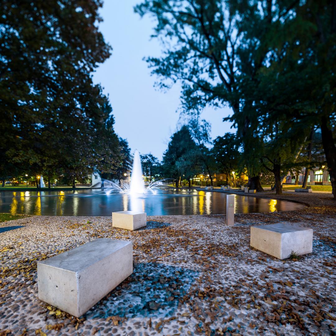 El jardín al sur de Piazza Dante en Trento ha sido reestructurado por Studio Raro, cuyo proyecto da valor a la presencia del pequeño lago con juegosacuáticos y repensando las áreas de alrededor como lugares de bienvenida y agregación