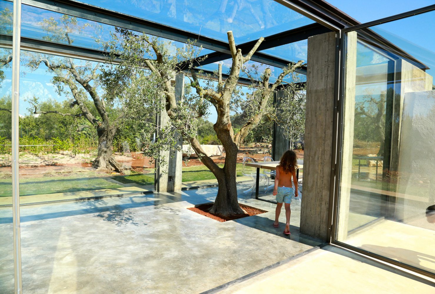 La parte "valiente" de la intervención vio la creación de un volumen inédito glass-room completamente transparente sin precedentes que hizo posible recuperar un espacio utilizado anteriormente como almacén de herramientas agrícolas, convirtiéndolo en un nuevo ambiente que amplía la sala. El cubo glass envuelve un inmenso olivo secular, una auténtica obra maestra de la naturaleza