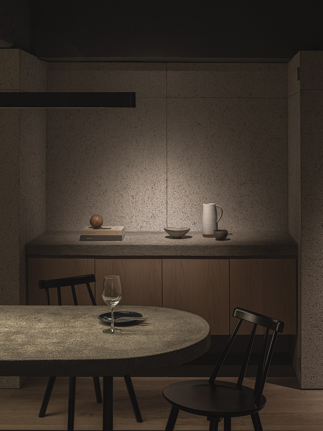 Grillno es un restaurante especializado en platos ahumados y a la parrilla, por lo que la idea era dejar la cocina abierta con una larga barra de hormigón alrededor para que la gente pudiera admirar al chef mientras cocina. Junto a la barra, también se diseñó una luz colgante larga de acero para iluminar uniformemente el área del comedor