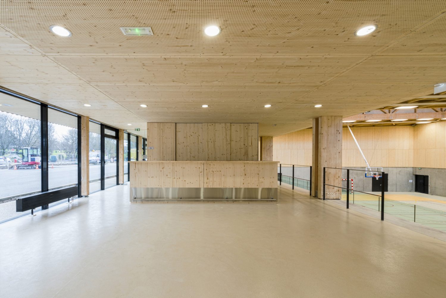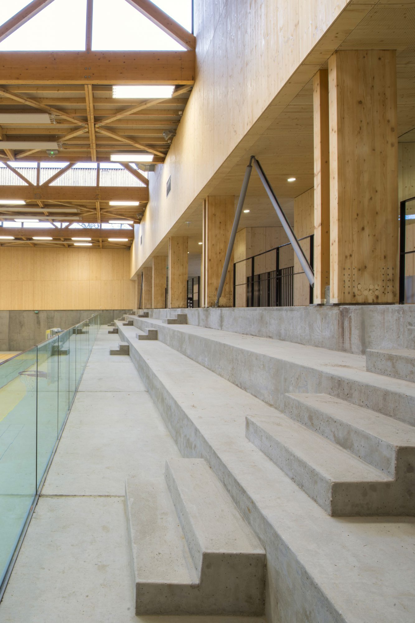 Los volúmenes están organizados de manera muy simple: las dos salas están dispuestas en ángulo recto alrededor de un bloque que alberga todos los servicios de apoyo, las terrazas ofrecen asientos para un máximo de 400 espectadores. La fachada completamente acristalada hacia la calle, ofrece vistas de las actividades dentro de la estructura sin perturbar los eventos deportivos o de formación en curso.