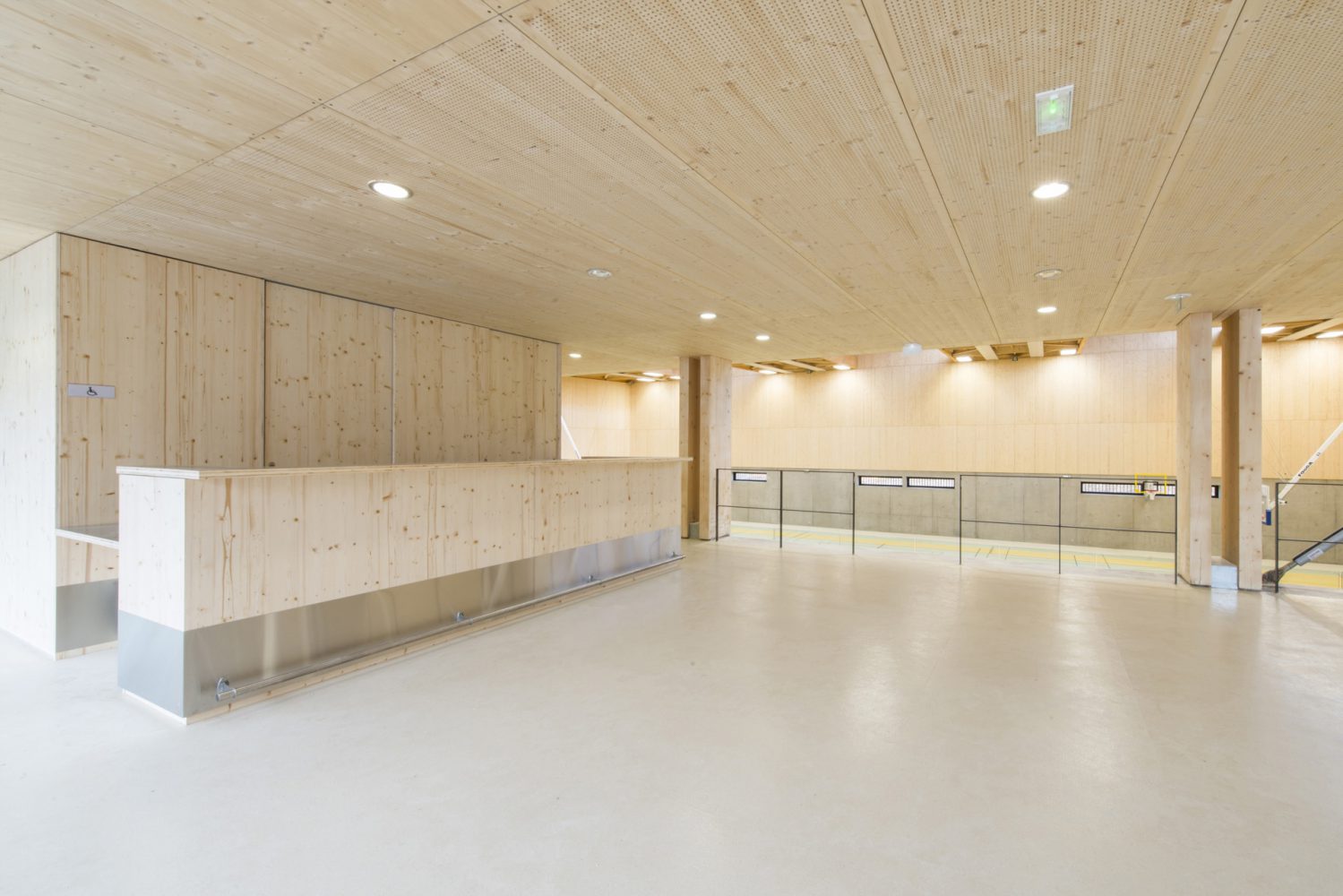 Como en todos los proyectos del estudio de arquitectura Tectoniques Architectes, el sistema de construcción es tanto comprensible como visible. Las paredes de cemento que soportan la altura de la sección subterránea del edificio han sido dejadas visibles desde el interior. Encima de estas paredes, las estructuras son todas de madera. La estructura principal está formada por una serie de marcos de portal. Estos están hechos de madera laminada, con pilares y vigas con una luz de 34 metros, colocados en una huella de 5,8 metros cuadrados.
