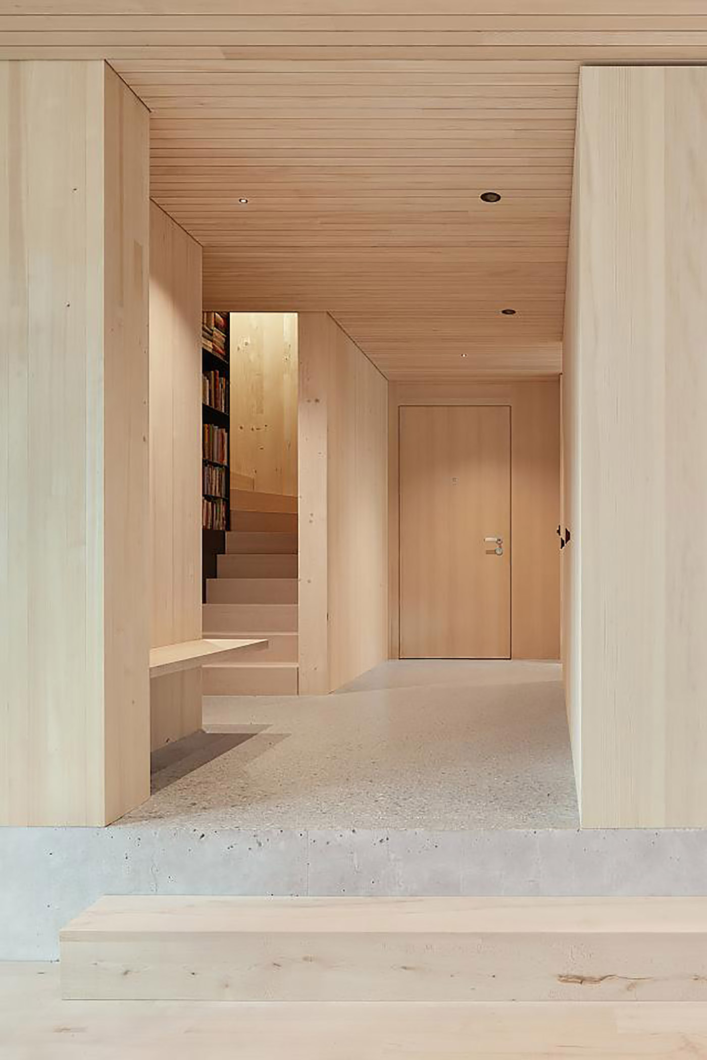 Como se ha mencionado anteriormente, la casa se construyó íntegramente con madera de bosques privados que, gracias a la repoblación forestal, en un intervalo de tiempo proporcionan a las generaciones de la familia material para sus hogares. Las paredes y los techos son de madera maciza de abeto de 24 cm de grosor, al igual que la fachada. El abeto se utilizó para las ventanas, los muebles y el techo acústico; el haya para los suelos y las escaleras, y el olmo para los muebles y la zona de estar del patio exterior