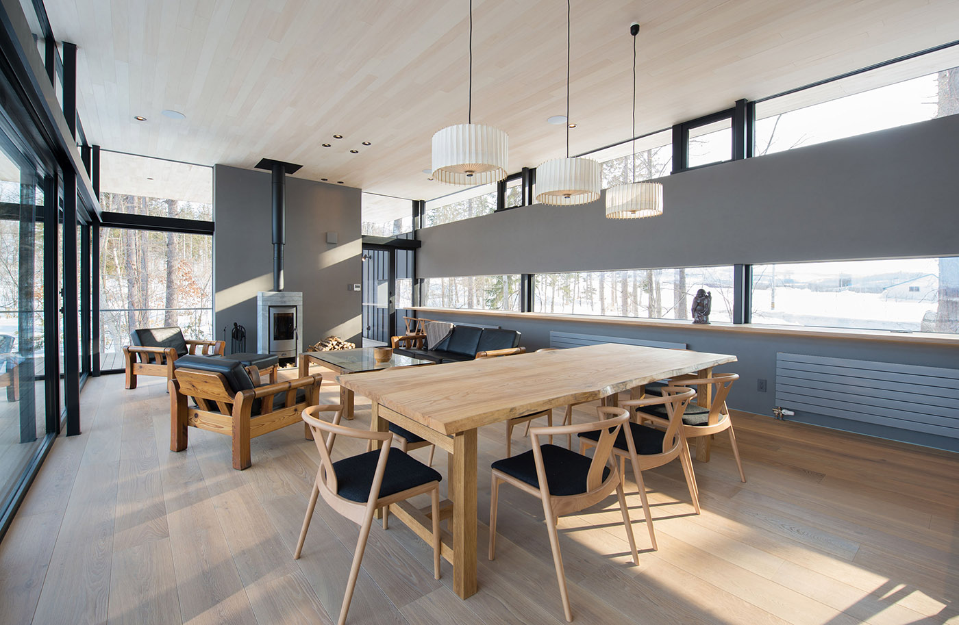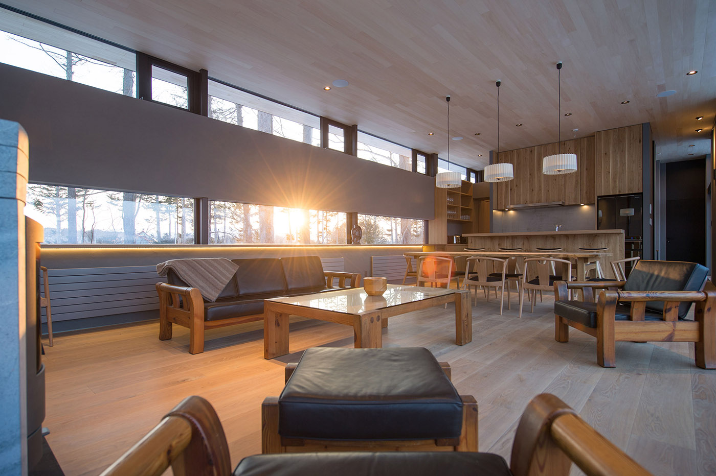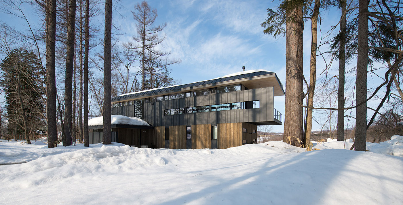 Un techo se asemeja a un ala donde debajo las superficies verticales de las fachadas se enfrentan en un diálogo enérgico entre el afilado metal y el calor del cedro de Dounan. La amplitud aleatoria de las superficies recuerda al motivo vertical de la vegetación circundante, integrando así la arquitectura de Hiyoku perfectamente en el paisaje que la rodea.