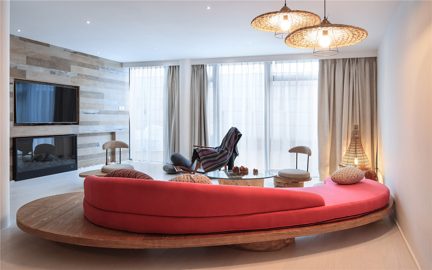 En el restaurante, una serie de “ramas” quieren crear la sensación de un bosque de montaña. En cada habitación la “fluctuación” se expresa a través de las formas orgánicas del mobiliario. El diseño general está concebido en madera y bambú, para exprimir el sentido ecológico del proyecto