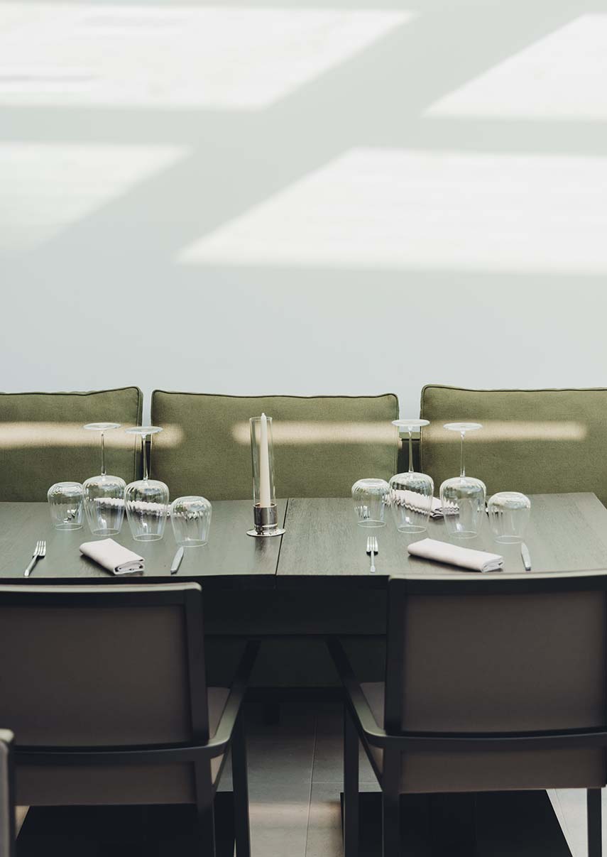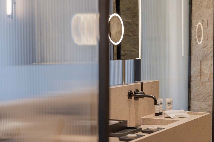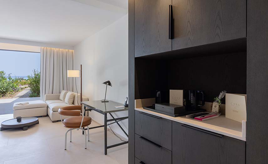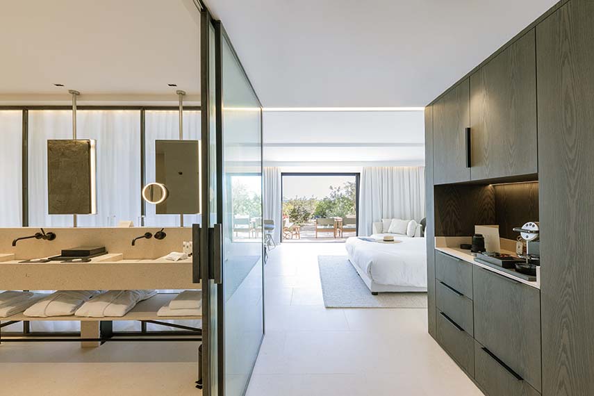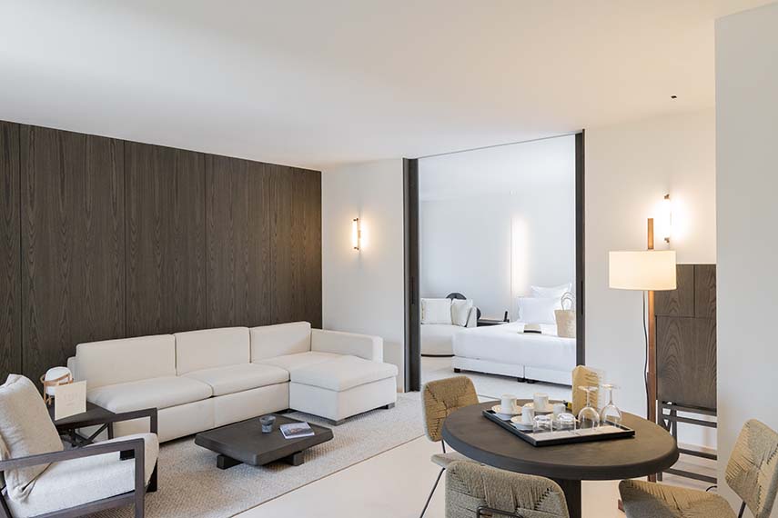De estilo esencial y fresco pero al mismo tiempo lujoso y cuidado hasta el más mínimo detalle, el hotel está diseñado como una residencia grande, íntima y reservada. Internamente predominan los colores claros, blanco y crema de paredes, suelos y tejidos, en contraste con elementos de madera oscura e inserciones metálicas que aportan refinamiento al ambiente